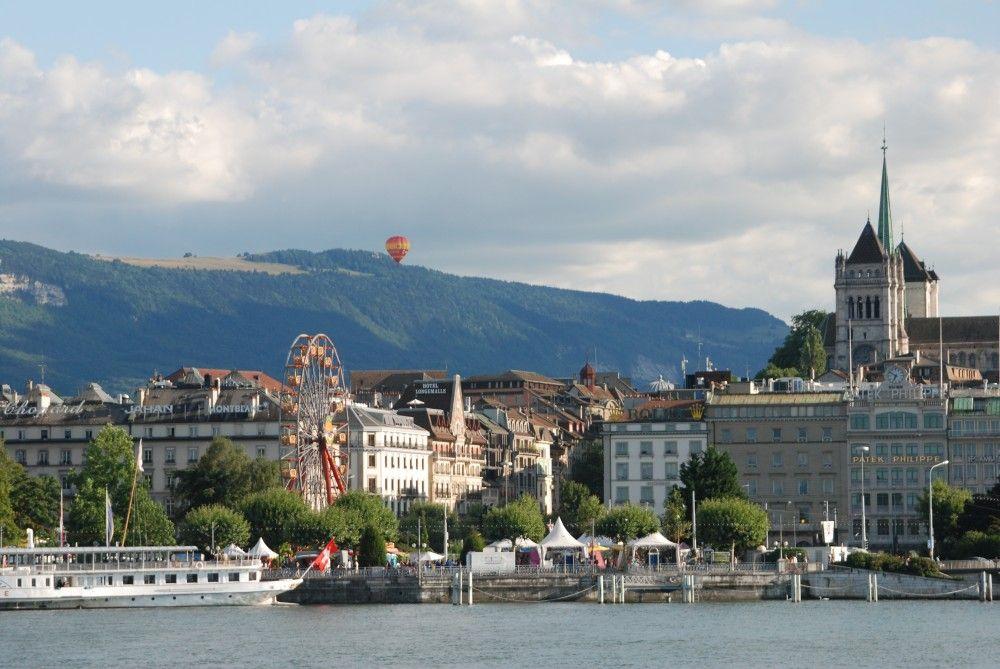 Our hotel was only a few minutes from the train station in Geneva; the taxi driver said it was too short for him to drive, so we walked. After checking in and relaxing for a few minutes, we headed to the lake and walked along the waterfront for a while. We crossed over the Rhone, passed the famous Geneva flower clock, and walked up to the the main church overlooking town, the St. Pierre Cathedral, before walking back towards our hotel. There was a carnival on waterfront; Nathan played some games and Chris rode a swing ride that went very high and had great views. The Geneva water jet "Jet d'Eau" which is normally on part of the time and sends a fountain of water 460' in the air, was not on at all. It must have been too windy. We returned to our hotel restaurant for dinner. That was a mistake; the hotel was nice, but the restaurant, which had 'authentic Swiss' food, left a lot to be desired. After completing the trip, we rated this food the second worst we had on the entire trip, and it ended up being the second most expensive. We found out later that Geneva is the fourth most expensive city in the world to live, so maybe the food was not overly expensive for Geneva.
