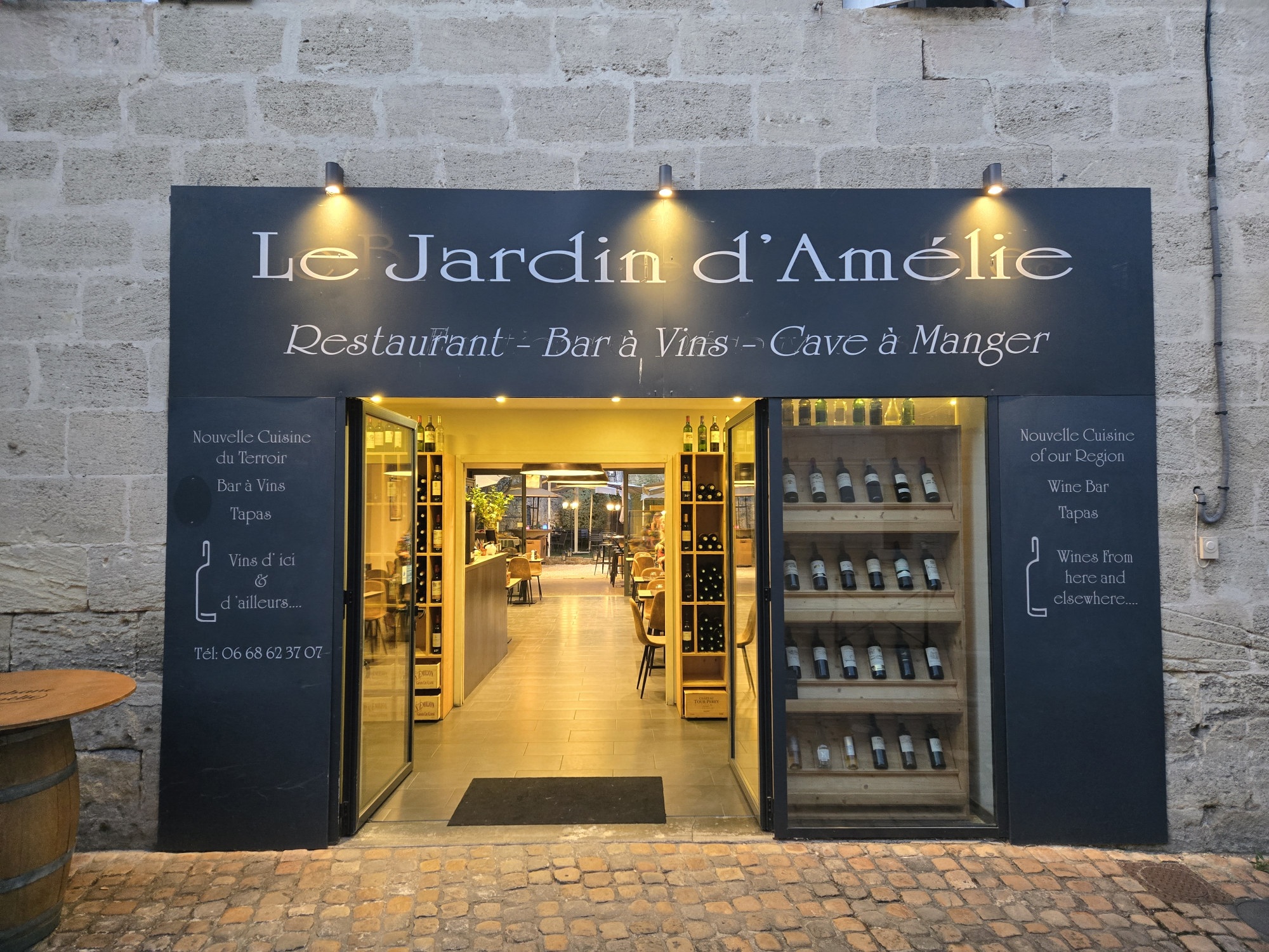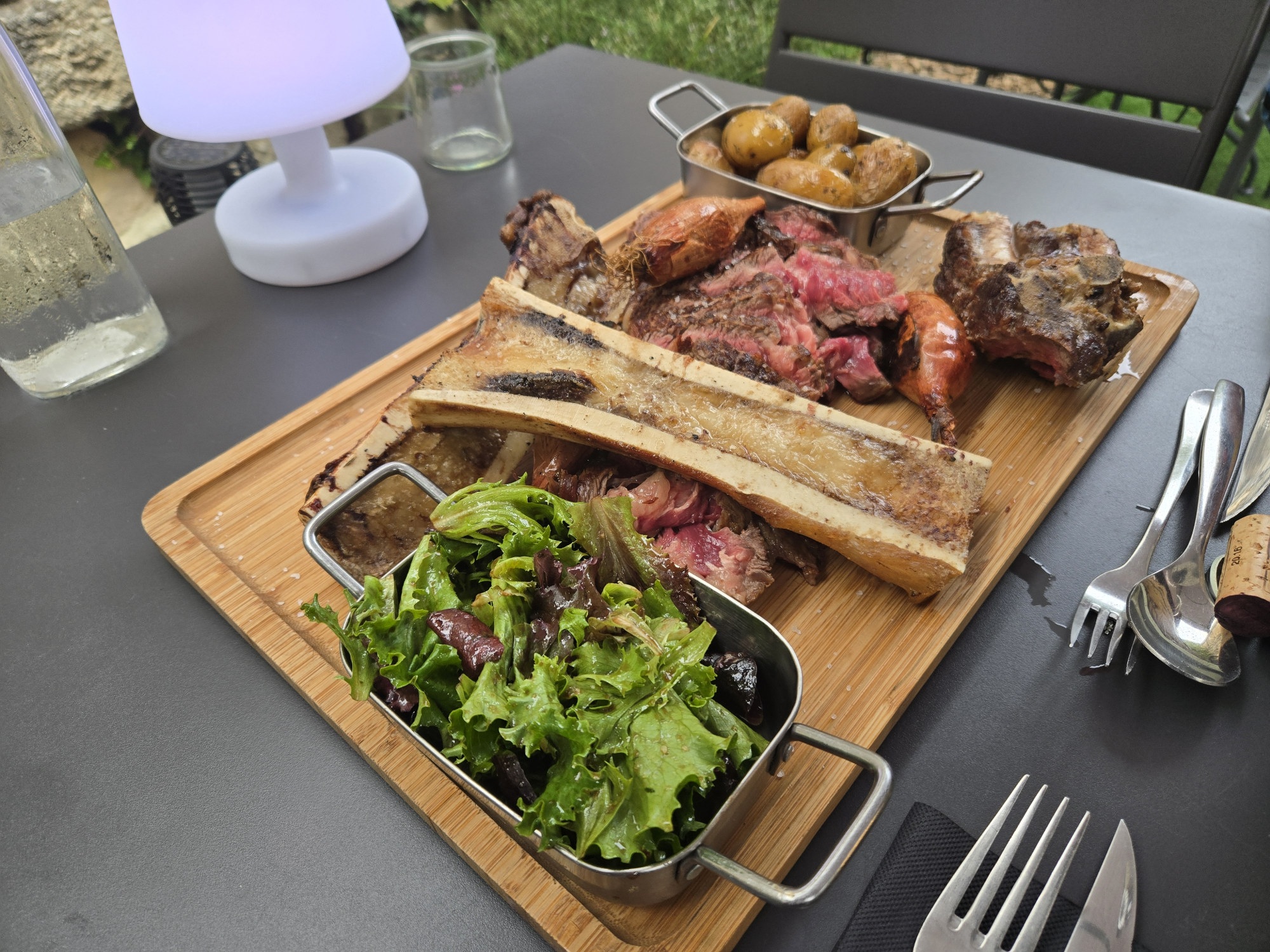 We toured the local area in the St Emilion wine train on the second day, visiting a winery and walking through their underground caverns wine cellar that was originally a limestone rock quarry. We had dinner on the second day at Le Jardin d’Amelie, where we ordered the Còte de Beauf which included prime rib, bone marrow, grilled potatoes and vegetables. The food was delicious and there was plenty of it, was cooked on the grill in front of us in the courtyard, was served with care, and the price was 1/3 the previous night, including an excellent bottle of wine.