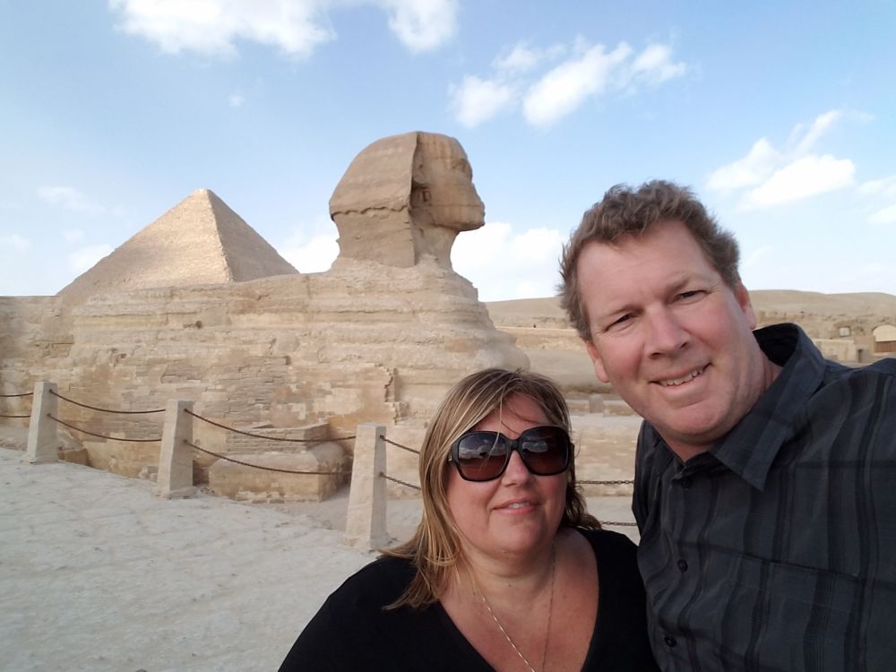 We boarded our flight to Cairo and arrived in the late afternoon to terminal 1. We needed visas to enter Egypt, which can be bought on arrival. They are $25 per person. Terminal 2 has automated machines marked “Visa” to buy those visas (we saw them on transit on the way to Thailand), but terminal 1 does not have those machines. There are five different Egyptian bank booths in the arrival area which sell visas, but they are not labeled. After asking where to get visas, we finally figured it out and were able to go through immigration. We had not experienced the outside of the terminal at Cairo Airport on the way to Thailand, and the first time out the doors was a shock. The hotel was supposed to have a person and van waiting for us for the ride over to the hotel on the airport grounds, but we did not connect as we were coming out of the terminal. Dozens of taxi drivers continuously asked us if we needed a ride; even after saying “No” they would not leave us alone. One taxi driver followed me around for about 5 minutes while I tried to find our hotel ride. We found out the next day from our tour guide that the best thing to do is to ignore them like they are not there. It is not rude; it is just how things are done. If you acknowledge their presence, even to say “No – leave me alone”, they will never stop. At one point, after the 28th person asked me if I needed a ride in the first 2 minutes out the door, I laughed and asked “Wow – is it always like this?” He laughed back and said “Yes”. A few minutes later, we found our driver; he was holding a sign with our name on it – we had missed him as we came out the door. We boarded the van over to the hotel and checked in. We stayed at Le Meridien at the airport, and cannot compliment the hotel and staff enough. They were fantastic the whole stay, going out of their way to help us and were very friendly. Our hotel travel status had us upgraded to a lounge room, so we had drinks, snacks, and food in the lounge each day.