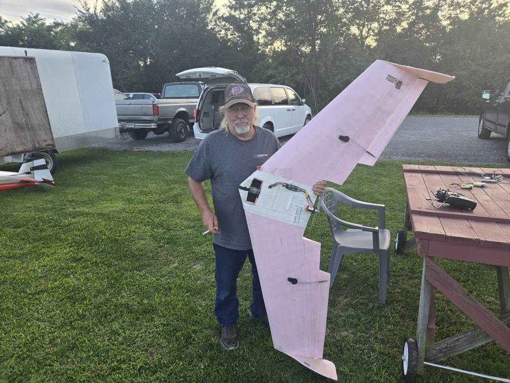 5.5 Foot Wingspan FPV Pink Wing - Moving to Texas - Donated to RCMB Member This is yet another flying wing made from pink foam. This one was made from the remainder of all the pink foam left over from my club group build. It is powered by a 450 outrunner and 50A ESC. This has a 800 TVL camera and 800mw video transmitter for FPV. The new owner at RCMB is shown in the bottom left photo. We flew it together with his recently purchased FPV goggles / video display at our club's RC social on the evening of 28 August 2025. I hope this leads him to many years of fun FPV flying. |