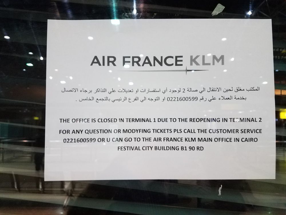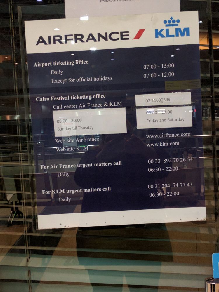 We took the hotel shuttle back to our hotel, and checked back into our same room. We logged into our Air France account to see that we indeed had been booked into the next available Air France flight to Paris, but it did not leave 24 hours later (the next morning) from terminal 1. Instead, it was leaving from terminal 2 at 1:35 AM. By coincidence, we found an article in the hotel magazine about this change - Air France was initiating a new airplane service from Cairo to Paris, on a different type of aircraft, on a different schedule, and the first day of service was supposed to on January 10. We were still scheduled to fly from Paris to New York to Washington D.C. on the same connecting flights 24 hours later, so that meant we would be spending about 7 hours at CDG Airport, Paris. We still had to somehow pay the change fees, and no offices anywhere were yet open. Once the Air France office in Cairo opened, we called them to verify if we could pay via credit card or had to come into the office. We were placed on hold, and then the call was dropped at their end. The Air France international customer service number would not connect, and the Air France customer service number in the US told us via a recording that they were closed. We headed downstairs to see if the hotel staff could help, as we may have been using the local dialing numbers wrong. The staff at Le Meridien was incredible and helped us far beyond what you would expect from a hotel. They called the local Air France office in Cairo, and after holding for a while they did manage to get through to customer service. The Air France ticket office service rep in Cairo told us (via the hotel staff translating) that they could not help us pay for the change fees in any method, in person or on the phone. They told us that we would have to go to the Air France ticket office at terminal 1. We told them that office was closed, and no one was there. This escalated up the service desk chain of command, until finally the Air France hotline supervisor "Ms. Amina" got on the line and assured us that the Air France terminal 1 ticket office was open until 3 PM, and someone would be there to help us.