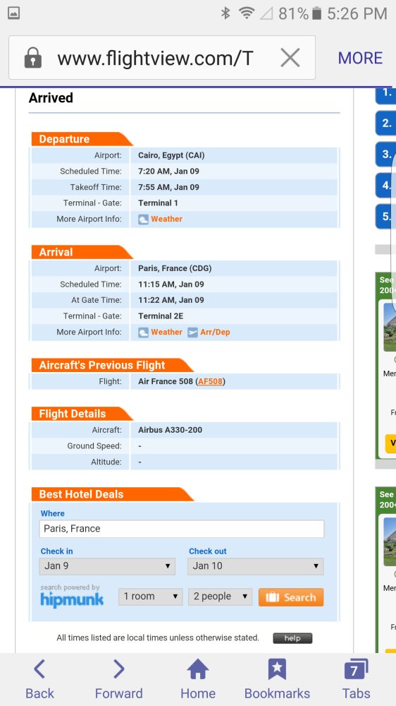 We found out later that Air France was moving from terminal 1 to terminal 2, and the flight we were supposed to be on was the last Air France flight out of terminal 1. Air France was moving to terminal 2, but had no yet opened the ticket office in terminal 2. We had no way locally to pay for any of the change charges we were getting saddled with. The airport rep told us that the only way for us to pay was to travel into downtown Cairo and pay at the main Air France ticket office there, since the airport ticket office was closed. To really rub it in, the flight we were supposed to be on was still listed as "Check-In" on the main status board at this time, right behind the guards who would not let us pass. We pointed that out, and were told that it did not matter. It was obvious they were not going to let us pass, so we finally gave up and and headed back to our hotel to work from there to revise our flights home. We found out later that the flight we were supposed to be on was delayed 35 minutes, not actually leaving until 7:55 AM, based on this report from FlightView, which tracks flight's actual departure and arrival times. Go figure - that last security line checkpoint was still screening people, just as we had expected. Having been waiting for 40+ minutes at this point, we actually could still have made it onto the flight if they had just let us pass.