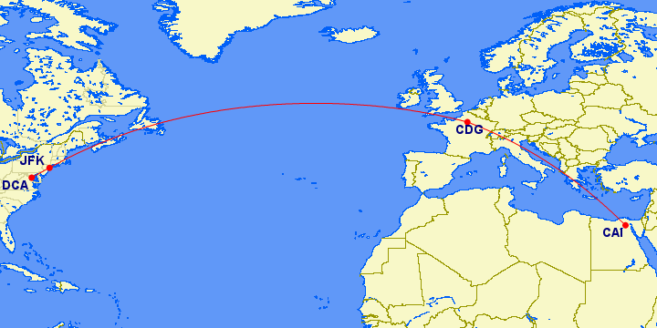 home on January 9, 2017. Cairo, Egypt (CAI) to Paris, France (CDG) to New York, USA (JFK) - Air France New York, USA (JFK) to Washington D.C., USA, Reagan Airport (DCA) - Delta Airlines |