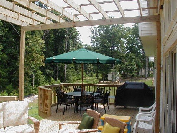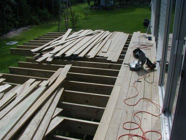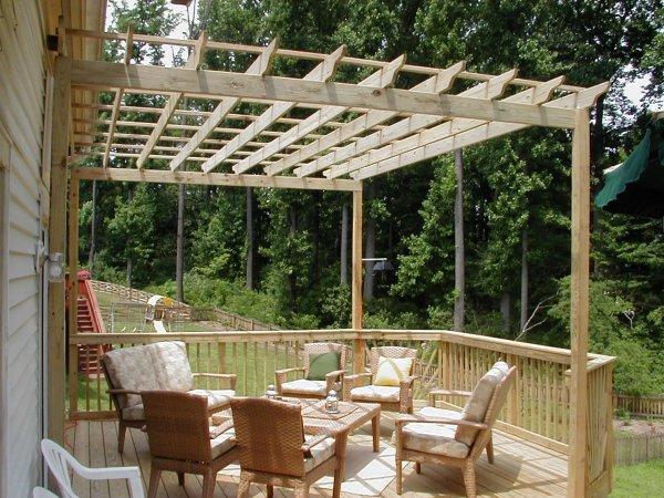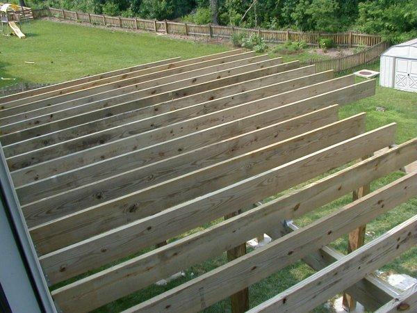 one piece at a time: 2x6 beams on top of notched out 4x4 posts, 5/4 x 6