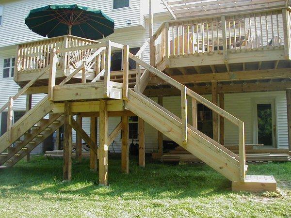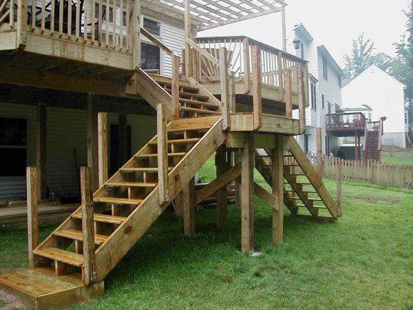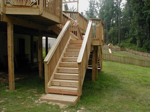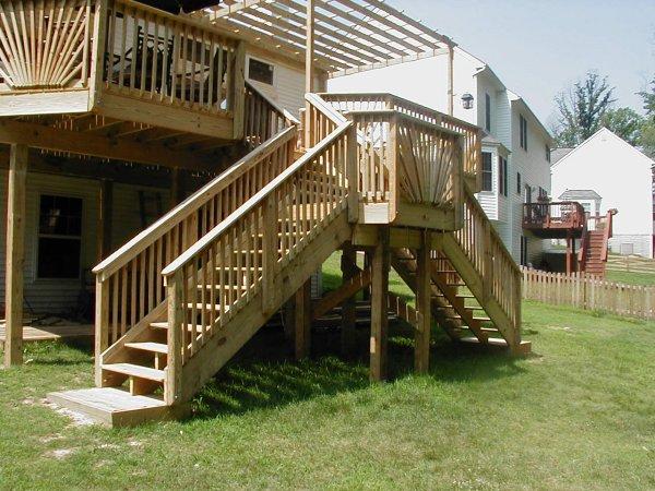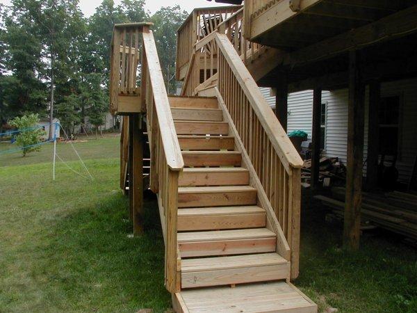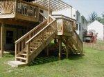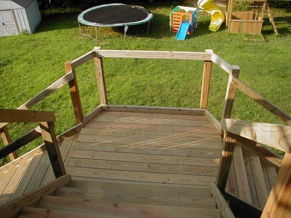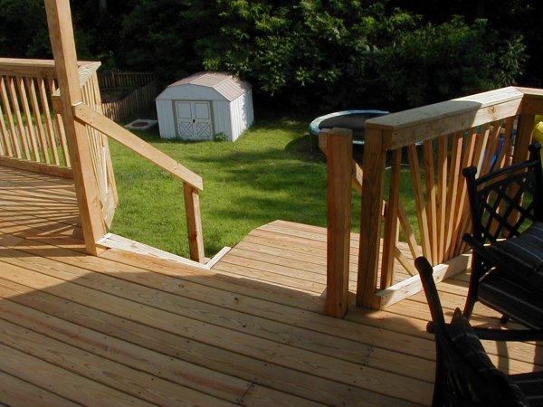 | We had originally planned on only one set of steps coming down from the landing, but a neighbor had a similar landing with steps coming down both ways, and it looked very nice. So we added the second set of steps. We put on posts for the railing.... | ||
