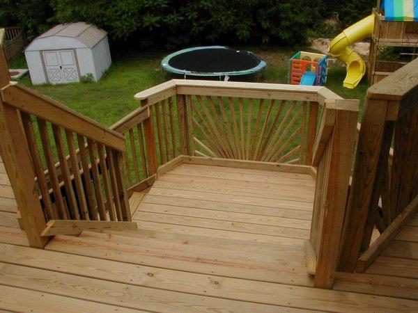 | The sunburst was added on the landing to accentuate that section of deck like the sunbursts on the main deck. The top stairs are extra wide to tie the landing in with the main deck. It seems more an extension on the main deck than a separate deck. | ||