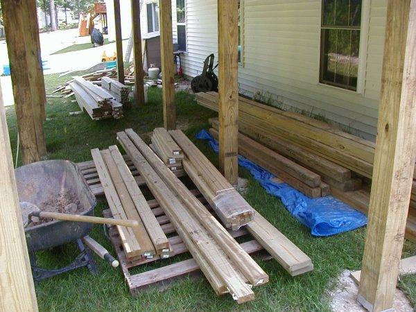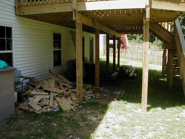 | These last pictures show how the big pile of wood that we originally had slowly dwindled. What was left was moved under the deck to keep it from drying out. There is not much left except for the refuse pile, some extra decking, and a few 4x4's. |