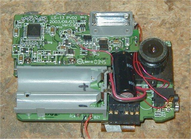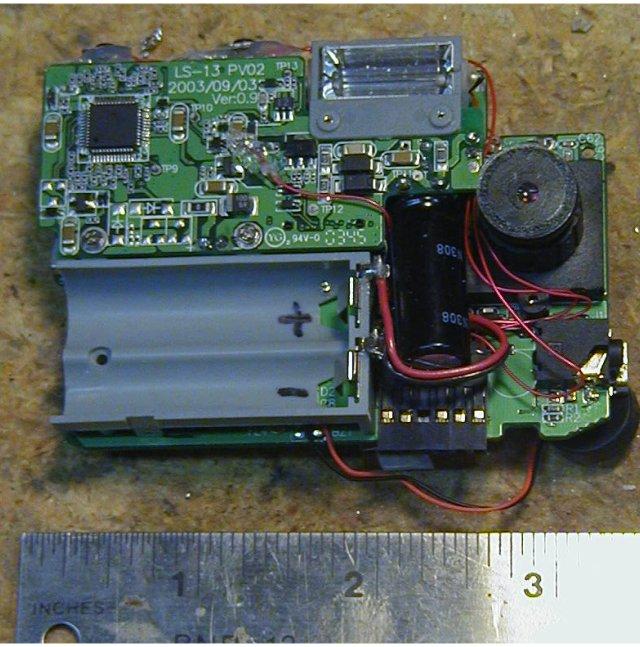 Some cameras have a sleep function that turns the camera off after some set amount of time to save battery life. If the camera is off, the shutter line by itself won't do any good; the camera must be turned on and this sleep feature must be overcome. The Aiptek Pencams all have ground-enabling wakeup buttons. In other words, to turn on the camera the ON button drives the connection to ground. Because of this, MR-RC-Cam's wakeup function drives the WAKEUP line to ground. These cameras will also have circuitry that must be traced to find an AWAKE line. An AWAKE line is active high (+3 volts) when the camera is on and 0 volts (or very low) when the camera is off. This AWAKE contact point must be located for each camera as they are different for every model. This AWAKE line is monitored by the PIC and if the line is low, the camera is off, and the PIC must drive the WAKEUP line to ground to turn the camera ON. Once the camera is on, the AWAKE line is high and the SHUTTER line can be momentarily driven to ground to take a picture.