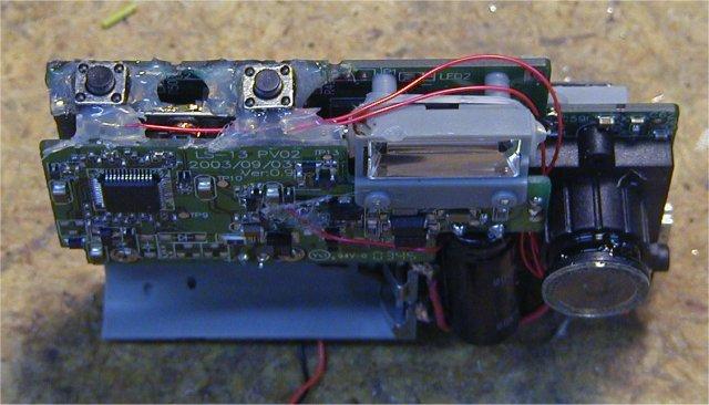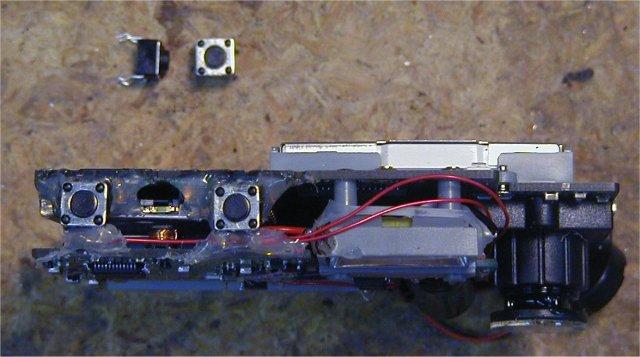 The micro switches that come with the camera for the shutter and on/off are very tiny and hide the connections that will have to be made to enable the shutter and WAKEUP (on/off) functions to be triggered electronically. If you want to set this camera up for that, you will need to remove the old switches and solder on new ones with extra contacts. The switch shown can be bought from most electronic supply stores and are designed to be mounted on printed circuit boards. They fit fine, but you will need to add potting compound or hot-melt glue (as pictured) to support them. You will also need to remove part of the top of the camera case to allow for their larger size. Be careful, the silver case highlites in the Argus camera case conduct electricity and these two switches should not have a circuit between them. |
