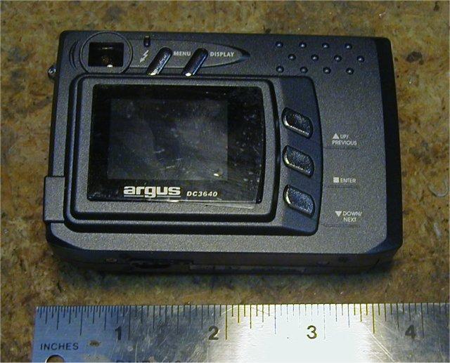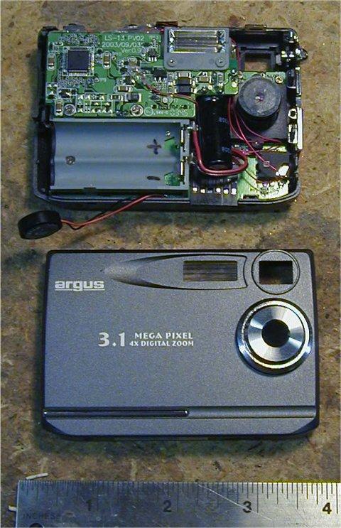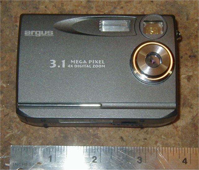 The Argus 3.1 MegaPixel digital camera has lousy optics; it's 3.1 million pixels does not produce a great picture and you can probably get close results with an Aiptek 1.3 Pencam. Why bother with it? It has an NTSC baseband video out, so it can be used to take still digital pics while at the same time the video output can be sent to an RF transmitter and the real-time video can be viewed on the ground. It takes standard SD memory cards, so the same card I use in my Aiptek SD can be used in this camera, and it records video at 30 fps with pretty good quality. I found my Argus 3.1 at CompUSA in the manager's specials for $50. If you can find a similar deal, buy it and see what you can accomplish.
