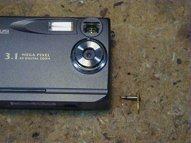 If you want to use the video out feature, plug in the mini-plug to turn off the LCD screen on the back of the camera and pipe the video signal to a transmitter. A neat feature here is that a metal dummy plug (it must conduct electricity) also turns off the LCD screen, saving battery life. Here you can see the dummy connector I made and where it fits into the side of the camera. It has a brass handle soldered to the end so it can be pulled out. Get it the right length so that when it closes the circuit that disables the LCD screen, it fits into the camera perfectly with no extra length. | |