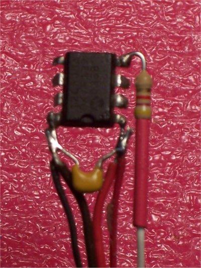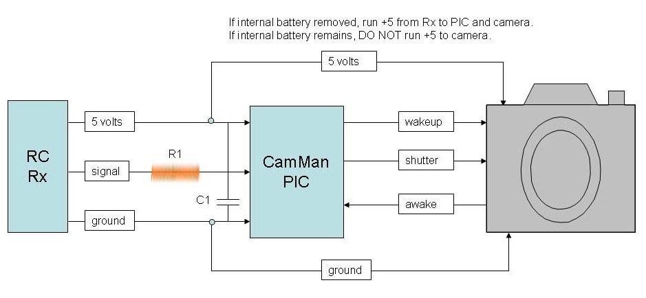 5. You must run all the lines from the CamMan PIC to the camera. With the battery removed, there are 5 lines: +5, GND, SHUTTER, AWAKE, WAKEUP. With the battery installed, there are 4 lines: GND, SHUTTER, AWAKE, WAKUP. If you took the battery out, you now have a place to put the PIC. If you leave the battery installed, the PIC will have to be installed externally to the camera case, since there is no other empty space in the camera. These pictures shows the connections that must be made to get this whole thing working. You must also run three lines from the receiver to the CamMan PIC. They are the power lines (+5, GND), and the RC signal line. Make sure to put the 0.1MF capacitor (C1) across the power lines at the PIC, and to put the 4.7K resistor (R1) in series with the RC signal line.