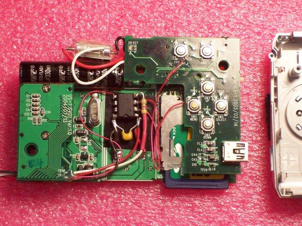 Radio Shack has stopped selling these 3 megapixel digital cams, but they can be had on eBay for around $30. They are small, lightweight, and take SD memory cards. The modifications to use this camera for AP are detailed here. This camera uses the 3 megapixel chipset from Smal; the Dakota uses the 1.3 megapixel chipset from Smal, so a lot of the drivers are interchangeable.I bought a Flatfoto 3 MP digital camera at Radio Shack a few months ago and finally got around to opening it up and modifying it for aerial photos. It lends itself very well for AP. It is very light, inexpensive, takes SD memory cards, will accept 5V from the receiver, and has the same voltage logic as the Aiptek Pencams. This last item means that Mr.RC-Cam's CamMan PIC will work with no changes. Please read his CamMan page for full details on how the PIC functions: http://www.rc-cam.com/project1.htm