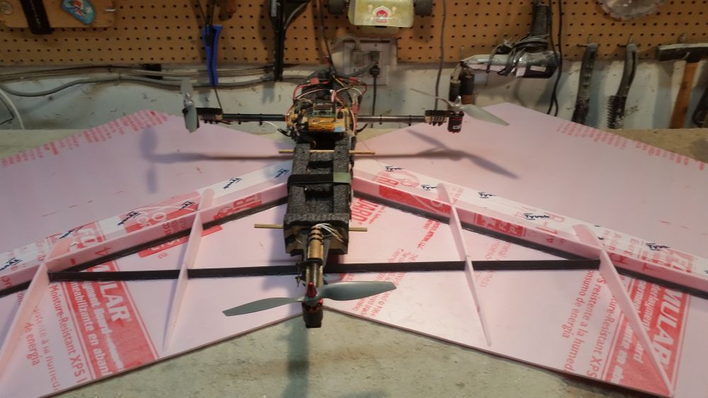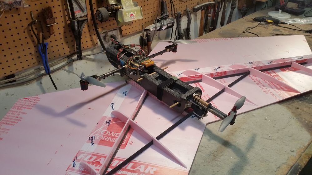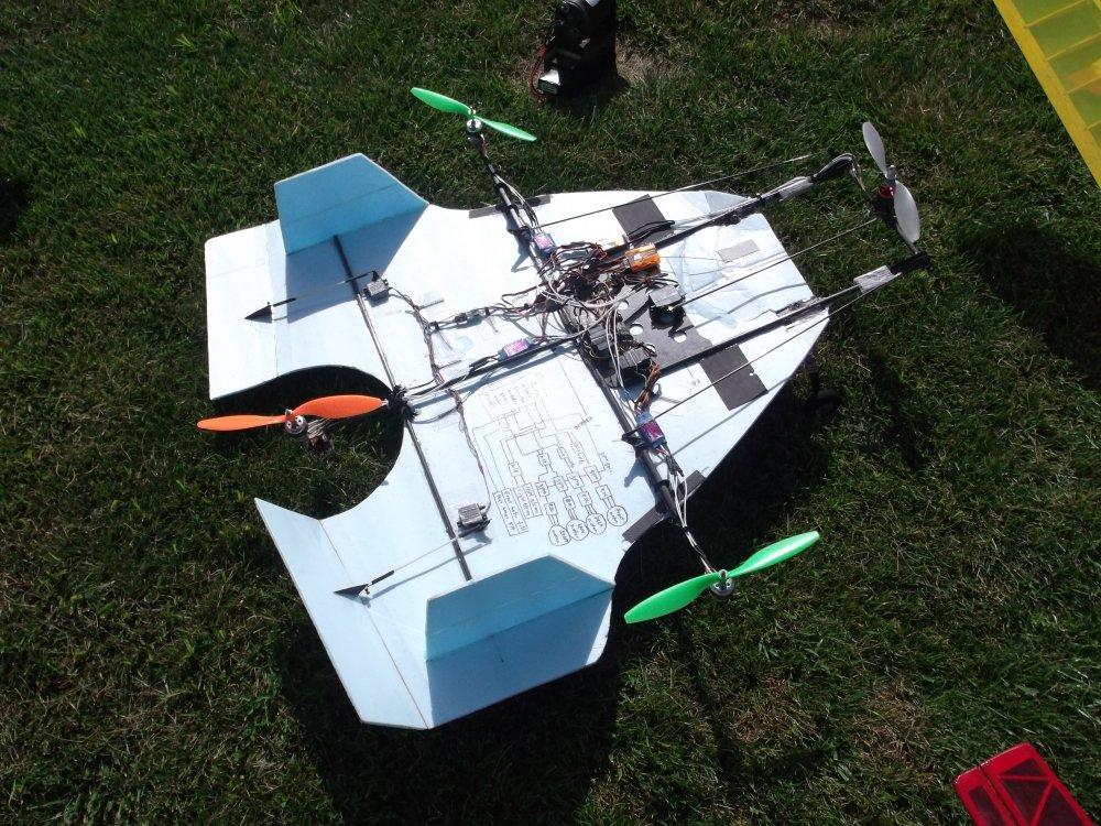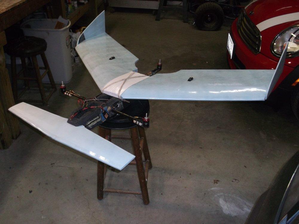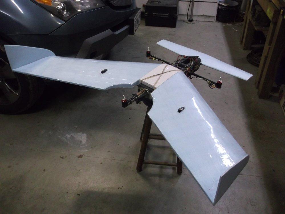 PHASE 1 consisted of initial testing with a tilting quad-copter. The quad-copter was made of BlueCor foam with carbon