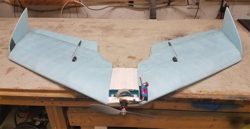 connected to the EPP foam fuselage from phase 1. The blue foam wing and