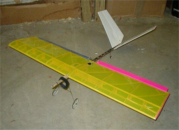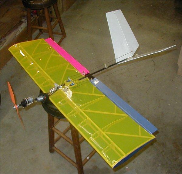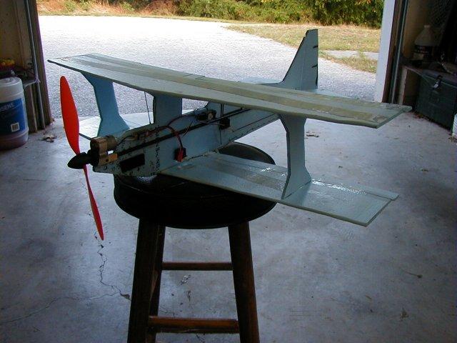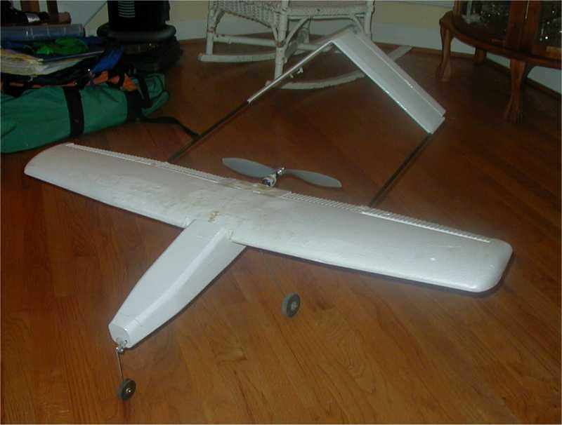 Vundango : This plane went through two forms before I found the version that flew well. The second picture shows the version that flew very well. It had a Speed 400, 2.5:1 gearbox, 12 amp ESC, GWS R-4P micro-Rx, and the controls were mixed ailerons and elerudders via electric elevon mixing and mechanical mixing. It was large version of the Tiny. I was showing off and flying low around some trees in my front yard. It got behind one set of trees and I lost sight of it. Next thing I knew it was on the driveway, with all the internal structure of the wings smashed to bits. The only thing holding it together was the Monokote. The motor, gearbox, and ESC were moved to a two meter electric flying wing camera ship for my Aiptek Pencam SD. FLOWN - CRASHED |