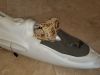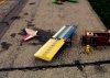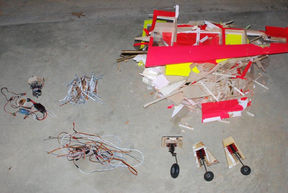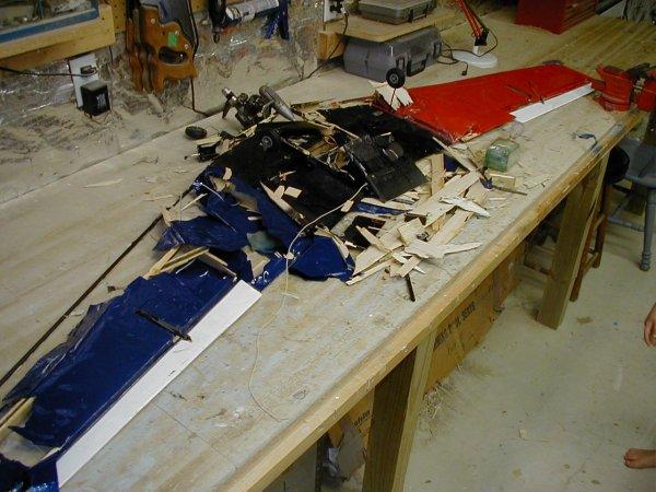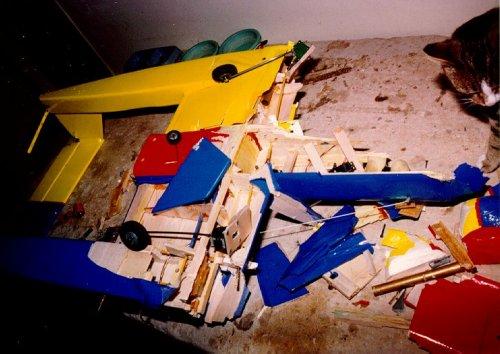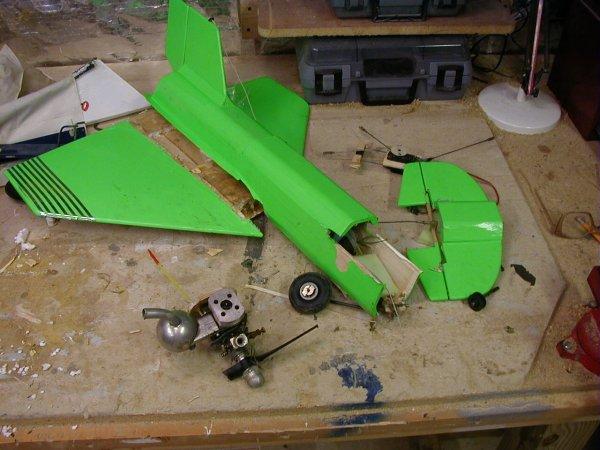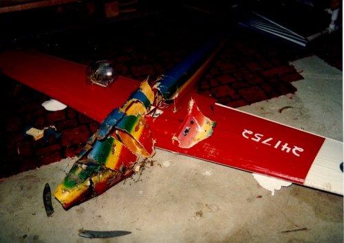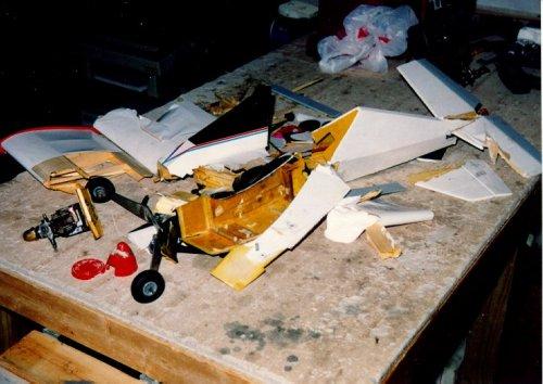 Tiporare : I still don't know what happened with this plane. I had been flying it for almost two years when it decided to call it quits. One day I took off, raised the gear, turned downwind, and then ..... nothing. It just kept flying at full throttle as it slowly rolled over and headed straight down. I killed the throttle and even turned the transmitter off and on. Nothing. It hit pointed straight down going at least 120 MPH. It made a respectable hole in the ground. The engine was buried a foot deep in dirt. The wing looks OK, but look again. It was a foam-core wing and was compressed chord-wise. It was unsalvageable. But the horizontal stab lives on in the ~Ultra Sport / Tiporare II. Post crash autopsy showed all connections to be intact and the battery to be well in the green. FLOWN - CRASHED |