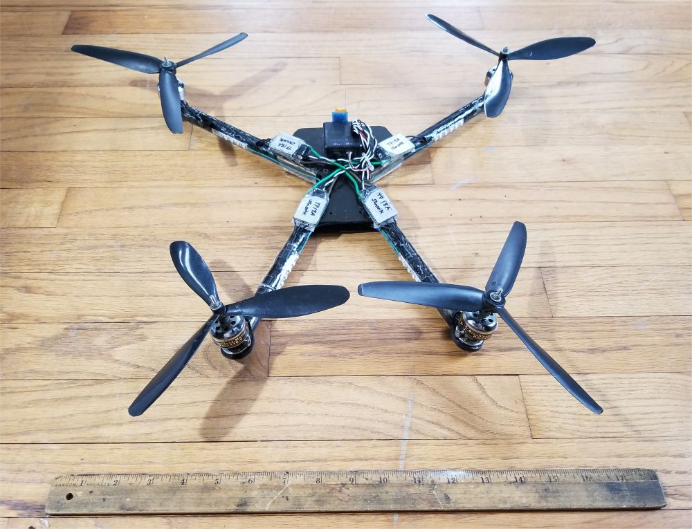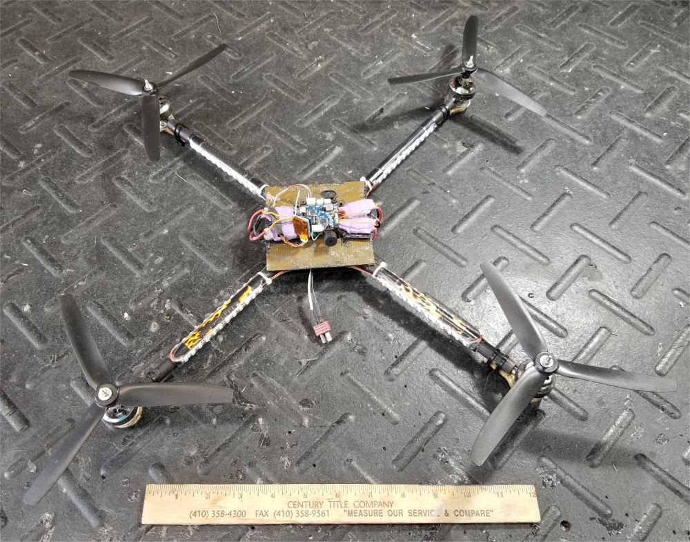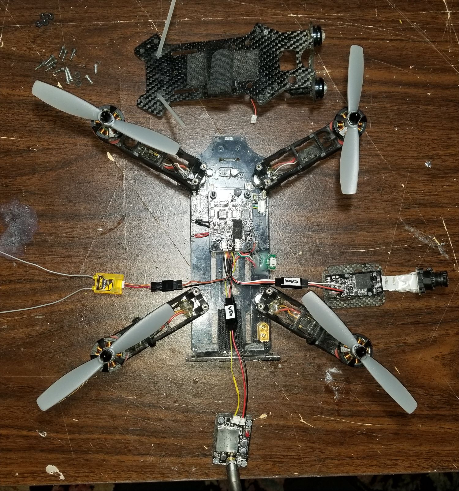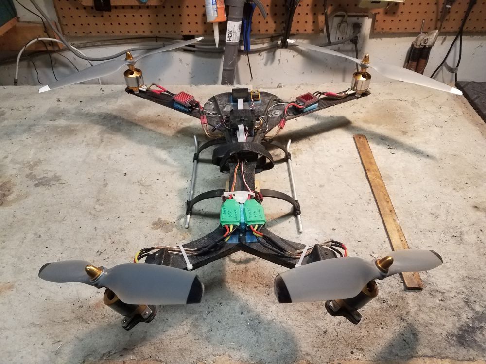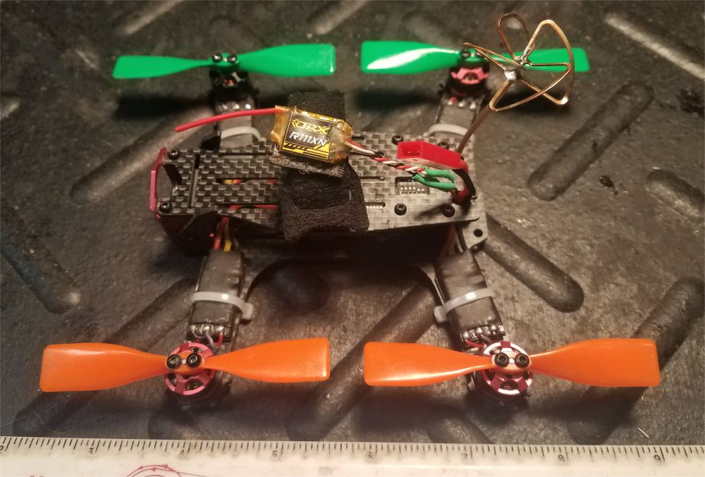 SOLD Home-made carbon fiber frame with 12V red, green, white LEDs on booms Flip32 F1 FC/PDB/OSD AIO, 3-6S input, manual - flashed & configured with BetaFlight 3.1.7 via USB TowerPro 2408-21 motor (x4) XP-12A compatible 12A ESC, no BEC (x4) - BlHeli firmware installed using Arduino Nano as programmer DSMX micro receiver with PPM output |