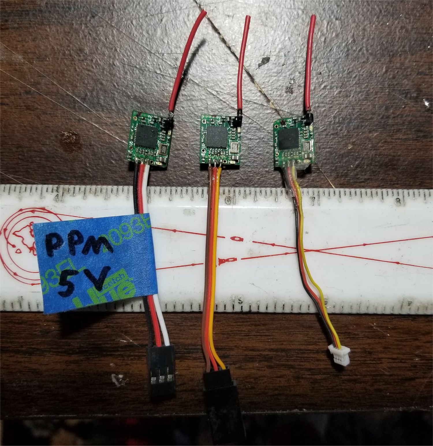 A-Tail 2410 LED - SOLD Home-made carbon fiber frame with 12V red, green, white LED strips on booms CC3D F1 flight controller, 5V input - flashed BetaFlight 3.1.7 with FTDI serial adaptor on flight controller COM1 - configured BetaFlight via USB - 7805 voltage regulator with 5V output for FC TowerPro 2410-9 1080kv motor (x4) TowerPro Mag8 18A ESC (x4), BECs removed - SimonK TP70A firmware installed via USBASP & Atmega socket tool - See this page for details on installing the correct version of SimonK firmware to the Mag8 ESC DSMX micro receiver w/ PPM output - use CC3D receiver port pin 8 for PPM input |