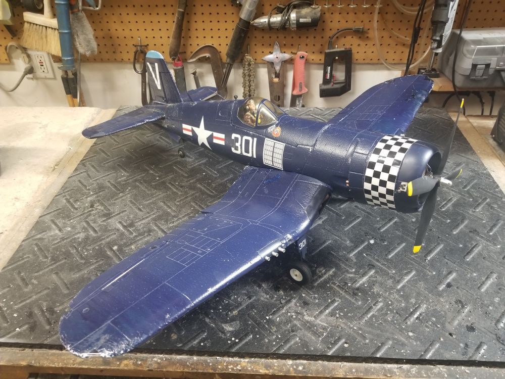 E-Flite F4U-4 Corsair - Moving to Texas - Donated to RCMB Member Foam ARF, 480 outrunner, 50A ESC, Six channels [ ailerons(2 servos), flaps (2 servos), elevator (1 servo), rudder (1 servo), retracts (electric), throttle (ESC) ] |