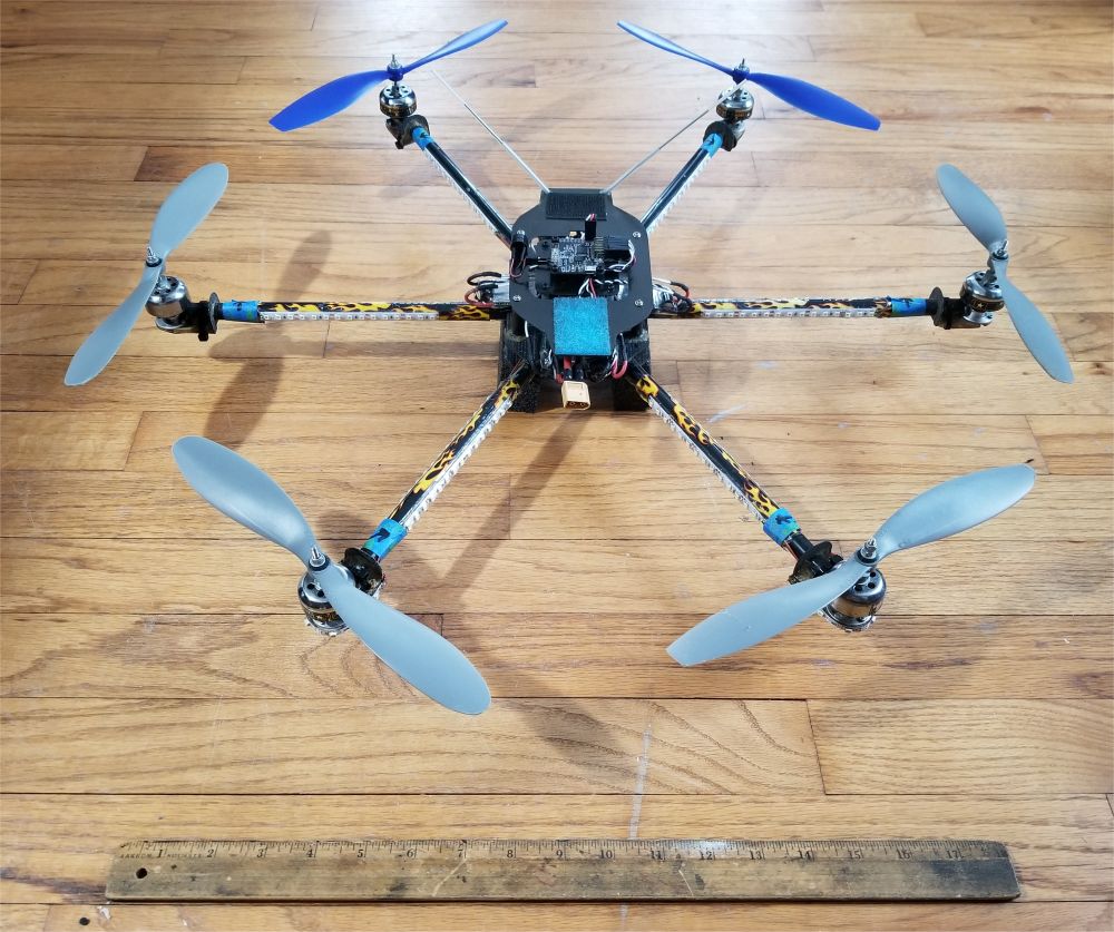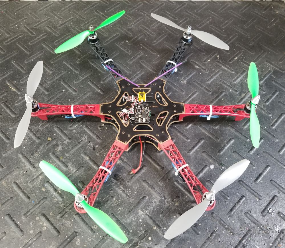 SOLD The Fusion Vortex F1 flight controller was on sale for $5 at HobbyKing. Using it took hours of Internet research, wiring, and circuit tracing with an oscilloscope. It includes an OSD and barometer for altitude sensing. Home-made carbon fiber frame with 12V red, green, white LED strips on booms Fusion Vortex F1 FC/OSD, with barometric pressure sensor, 5V input - see this page or this thread at RCGroups to learn how to use the Vortex F1 FC on a non-Immersion multi-rotor - flashed & configured with BetaFlight 3.1.7 via USB - second ARM processor on FC board runs Immersion OSD - breakout board added to Fusion for easy connections TowerPro 2410-9 1080kv motor (x6) TowerPro Mag8 18A ESC (x6), BECs removed - SimonK TP70A firmware installed via USBASP & Atmega socket tool - See this page for details on installing the correct version of SimonK firmware to the Mag8 ESC Orange 617XL DSMX PPM Receiver Matek power distribution board with 5V output for FC |