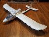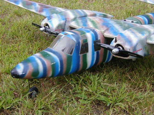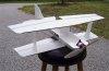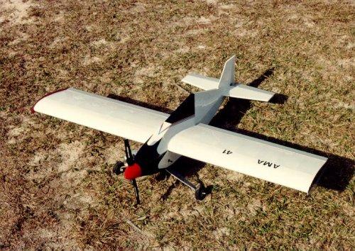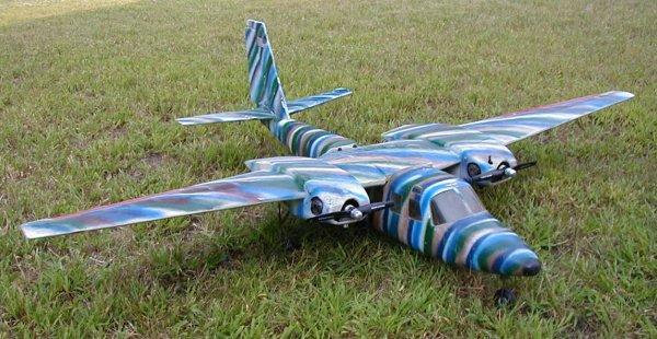 P-38/P-61/F-82/OV-10 Wanna-Be : This self-designed plane flew great for two years until I decided to get creative. I moved the engine to the back of the main body and added a nose cone with weights where the engine had been. I thought I had the CG correct. Nope. It was way too far back. The plane got to about 10 feet altitude while doing a great saber dance. It oscillated back and forth several times before deciding to head back to terra - firma. In this instance, terra - firma was blacktop and none too forgiving. The wingtips survived. FLOWN - CRASHED |