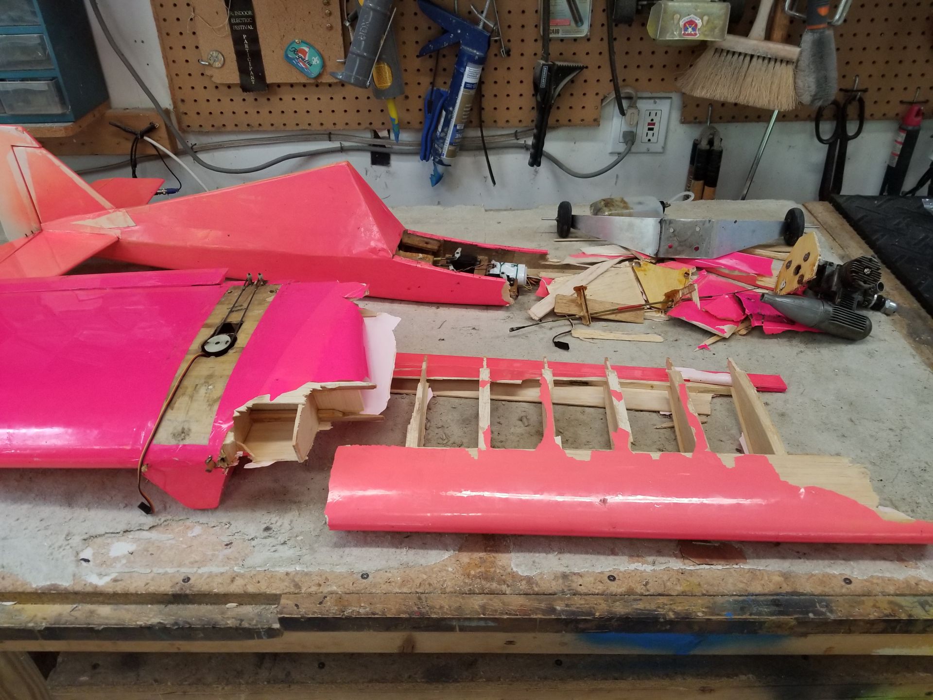 Pink Super Hots (60 size): I re-covered the wing from my old Midwest Super Hots in 2002 and built a new fuselage that I flew for 18 more years. In late 2020, the engine died right after takeoff and the plane dropped out of site at the south end of our club runway. I could not see it; it must have stalled and dropped on its side, as the right wing was broken into many pieces, along with everything on the fuselage from the wing forward. I have been flying this airframe for 31 years, and I have so many other planes to fly that I decided to not spend any time to repair it. FLOWN - CRASHED | |