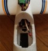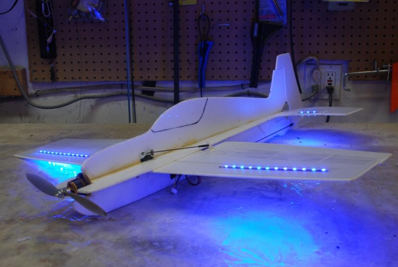 Member This plane has 4+ meters of LEDs running through it, lighting it from the inside for night flying, shown to the left. Turnigy E500 6T 4000kv outrunner, 30A ESC, EPP foam, three channels [ elevator(1 servo), rudder(1 servo), throttle (ESC) ] The new owner at RCMB is shown in the bottom left photo; he plans to give this to a neighbor's child and teach him to fly. |