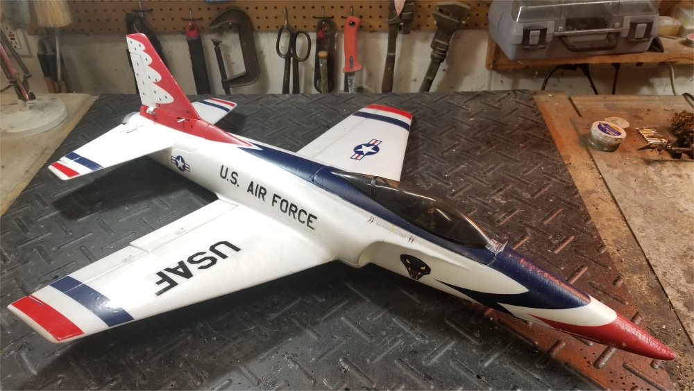 Horizon Hobby HABU-2 Electric Ducted Fan : This is a smooth flying aircraft. I bought this brand new at a swap meet. I added flaps and flew it that way with fixed gear for a few months. When HobbyKing had a sale on electric retracts, I added them to the airframe. Stock motor and ESC, running on 4S lipo. Six channels [ ailerons(2 servos), flaps(2 servos), elevator(1 servo), nose steering(1 servo), rudder(1 servo), retracts(electric), throttle(ESC) ] SOLD | |