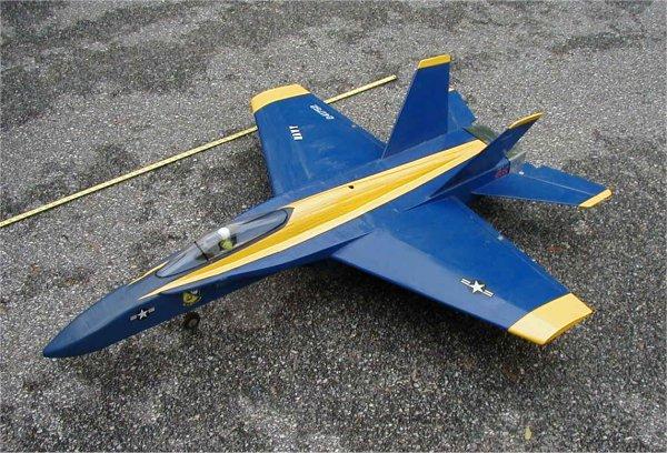 F/A-18 : Built from Mike Pastro's F/A-18 pusher plans in RCM, heavily modified and ducting added. It was painted in Blue Angels markings. OS 65 VR-DF & pipe & Turbax III fan unit, mechanical retracts, five channels [ ailerons(2), elevators(2), throttle(1), nose steering(1), retracts(3) ] SOLD |