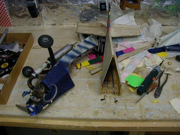 Conniption I / Conniption II : I designed and built this aerobatic plane and used the landing gear and engine from the crashed Hots II. The plane was a great success. It flew for over three years until I tried a Lomcevak about 40 feet off the ground. It did the maneuver fine, but I fumble - fingered it and smacked it into the desert. I took the pieces of that crash and built the Conniption II. It was the same design with a few minor changes. The wing center section was beefed up and the barn-door ailerons were integrated into the wing structure. This plane could do everything that its daddy could do, plus fly a lot faster. Unfortunately, the second weekend I took it out to fly, I smeared it all over the desert in about the same spot its papa had bought the farm. I was doing a series of snap rolls going upwards when the hatch lock came undone and the receiver battery went ballistic. I found the battery pack 150 feet from the crash site. The plane just kept snapping up and over in a nice arch. My kids thought it made a very nice mess on the desert floor. The same landing gear and engine live on in the Conniption III, which I have been flying since 2002. FLOWN - CRASHED This story and picture won the "How mangled did you go?" contest at RCUniverse, for which I won a Fliton Flubber. |