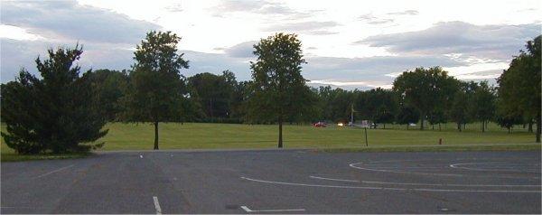 down on the field, in front of the pits.