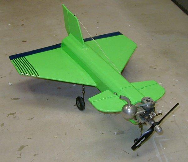 Javelin (sorta): Built from RCM plans to match a small foam-core wing I had. My version has a longer body length -to- wingspan ratio than the plans, and the wingspan is smaller. I finally got this plane in the air with a long run down the runway. It just did not have enough wing area for its weight. After several circuits of the field, during which I discovered that the max speed was about 2 mph faster that the stall speed, I decided to land. As I brought the engine back, it died and the plane dropped like a brick. At 45 degrees nose down, no amount of elevator would slow the descent. It hit soft sod and the damage could probaby have been repaired in less than an hour, but the flight characteristics don't merit a rebuild. FLOWN - CRASHED |