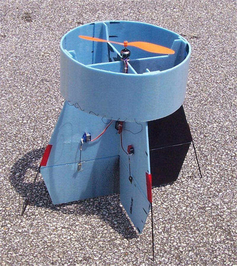 VFO VTOL: Copied from pictures of the ElectriFly VFO. This uses the same mixing as my NightOwls, minus the second motor. 2410-09 outrunner and 18 amp ESC, and four HXT500 servos. Five channels [ elevons(2), rudder1(1), rudder2(1), ESC ] FLOWN - retired | |
