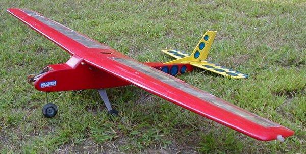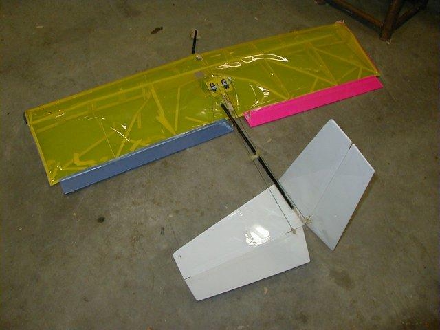 Fun-Fly : I took the wingtip plug-ins (2 feet each) from the crashed plane above and joined them to make this fun-fly plane, complete with carbon fiber tail boom. OS 40, 4 channels [ailerons(2), elevator(1), rudder(1), throttle(1)] SOLD |