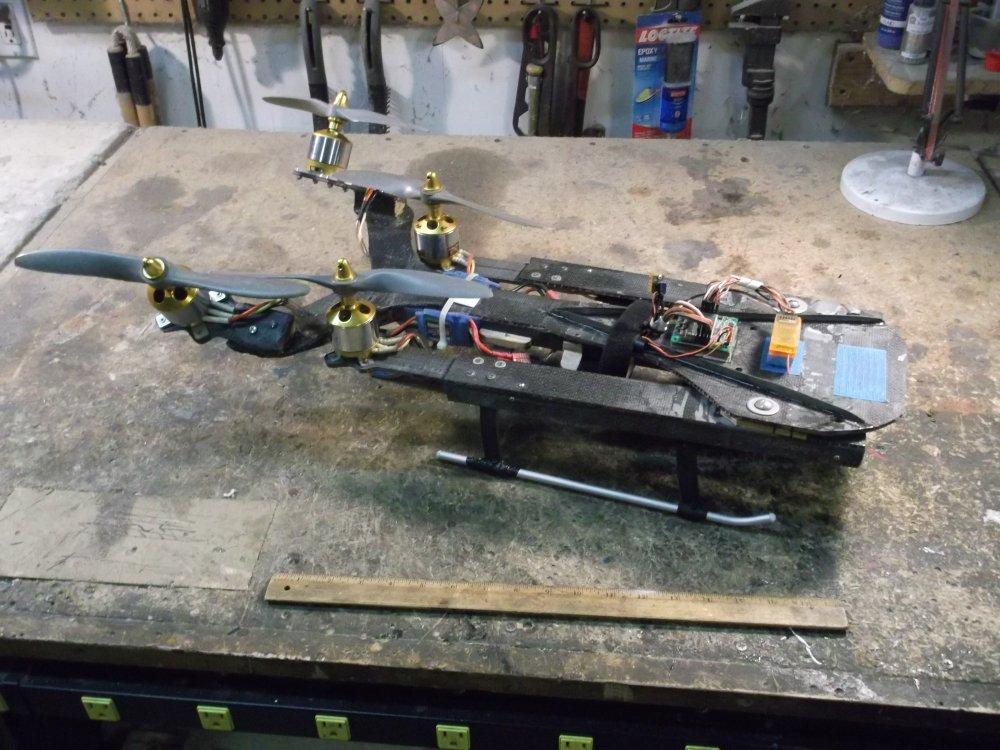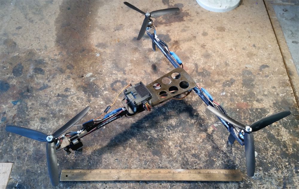 FLOWN - retired My original large Tricopter was converted to this large A-tail quadcopter by adding a split tail and fourth 3520 motor and ESC. The two rear motors were tilted out and are mixed for up/down thrust (collective) and yaw. The forward arms could be folded back for storage and transport. This was flown with stock ESC firmware, small props on 6S, and a KK 2.0 FC. I later upgraded to big props on 4S, SimonK ESC firmware, and a KK 2.1 FC. I didn't fly this enough, so I took it apart, put the carbon fiber into my parts bin, and moved the motors and ESCs onto other aircraft. - home-made carbon fiber frame, front arms fold back for storage - TowerPro 3520 motor (x4), soft mounted on rubber o-rings - this motor measures 45 mm x 72 mm and is rated at 1000 watts (4S x 66 amps) - Red Brick 50A ESC, no BEC (x4), reflashed with SimonK via USBASP & Atmega socket tool |