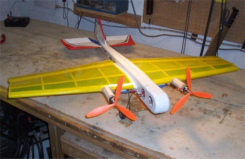 Bridi Aerocommander Shrike : Kit built fiberglass fuselage and cowls, built-up balsa wing created from scratch to replace the original foam-core wing lost in a crash. (2) Magnum 40 FSR (counter-rotating), four channels [ ailerons(2), elevator(1), rudder(1), throttle(1) ] SOLD |