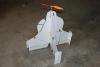 F-27 Thrust Vectored Stryker: EPP foam. The motor had a 2-D thrust vectoring system. Motor pitch was driven by the elevator, and motor yaw was driven by rudder. These mixes could be activated by a single switch, so the plane was launched with normal controls and then the motor 2-D vectoring was turned on at a safe height. The plane would spin like a top with full yaw commanded. It was powered by a rewound KD A22-20L outrunner brushless motor and a folding 9x6 prop with a homemade hub. Five channels [ elevons(2), motor tilt (1), motor yaw(1), throttle(esc) ] FLOWN - retired | |