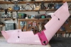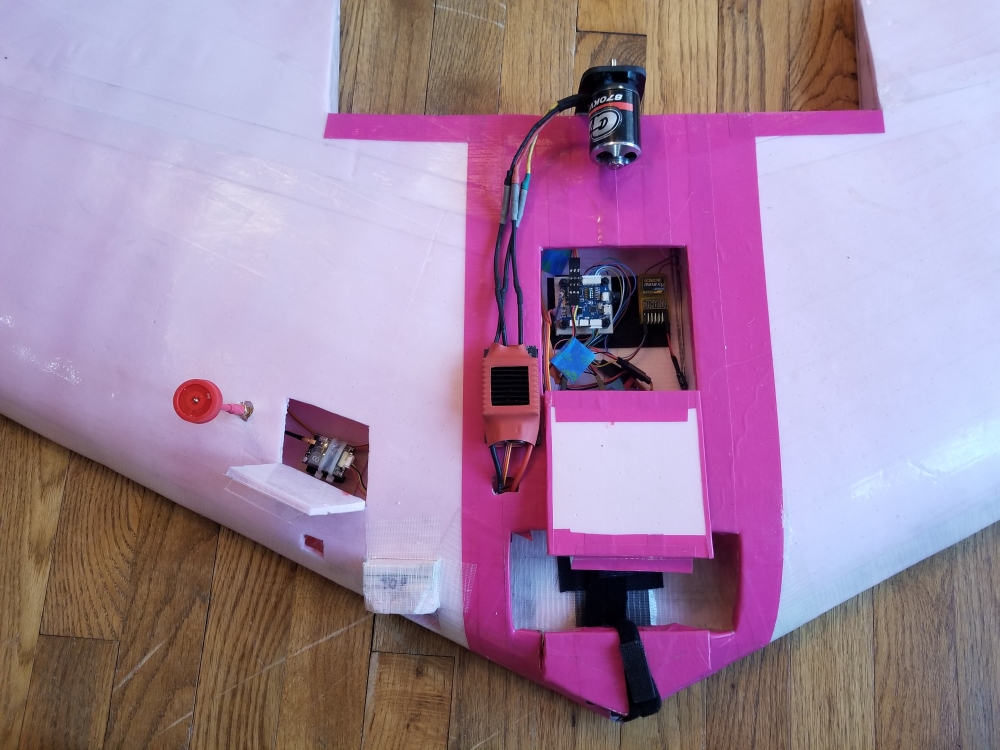 8.5 Foot Wingspan Pink Wing LED FPV - This wing is powered by a large brushless outrunner with a 70 amp ESC, spinning a 16" pusher prop. The motor runs on a 5S lipo and draws 1000 watts a WOT. This wing takes off at 1/2 throttle in less than 50 feet, and flies around easily at 1/3 throttle. This wing uses a very similar layout to the 9' Blue Wing above, with one HK401B gyro on each servo for stabilization, and 6 super-bright LEDs facing down. The super-bright LEDs are controlled by a homemade flashing circuit with a PIC 12C508 reading a channel from the RC receiver and driving five TIP120 transistors. The circuit and PIC code is available on the LED page. FLYING - FPV This wing was originally powered by a 4.75" electric ducted fan, shown to the bottom left, but I replaced that with the outrunner and pusher propeller which is much more efficient and quiet. The ducted fan version used a 60 amp high voltage ESC, which I reflashed with BlHeli firmware. It drew 45 amps @ 37.8 volts (9S), or 1700 watts at wide open throttle on a fresh battery. Eachine 800mW 5.8GHz video transmitter 1200 TVL 5-12V camera LC filter for cleaner video OSD for battery voltage - dual voltage sensors; sensor #1 reads the main pack voltage (5S), and sensor #2 reads the separate FPV battery voltage (3S) GoPro mount |