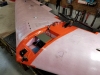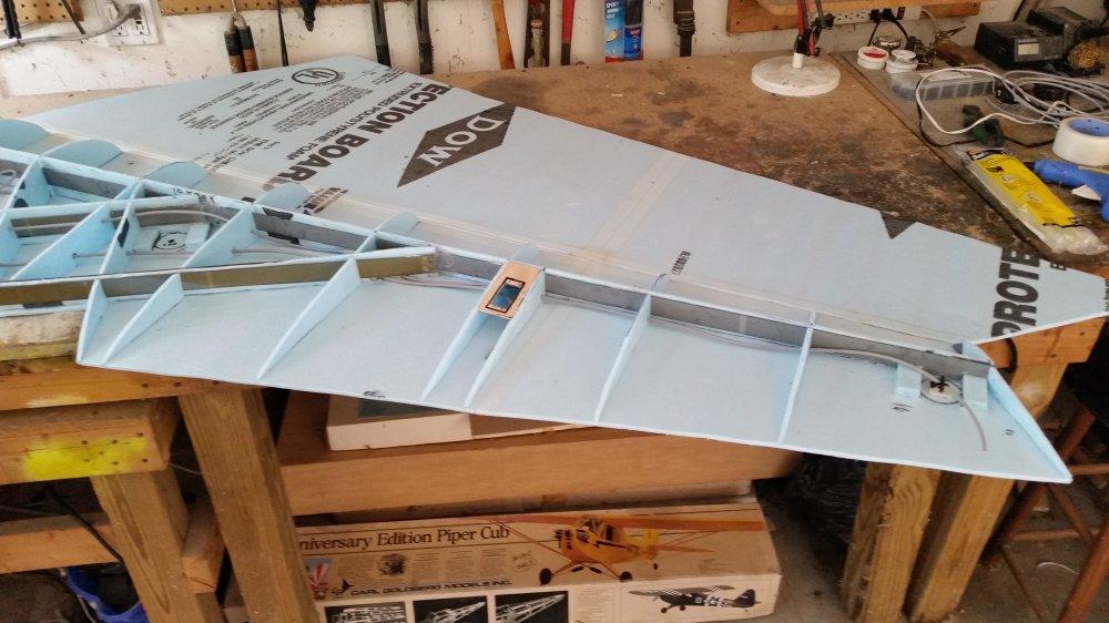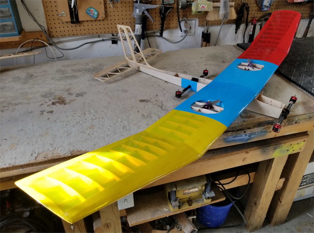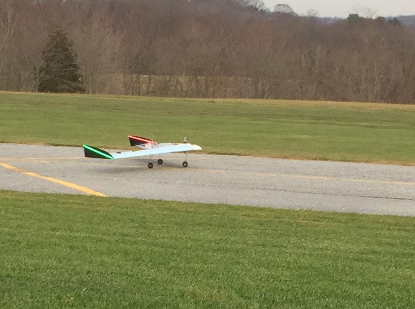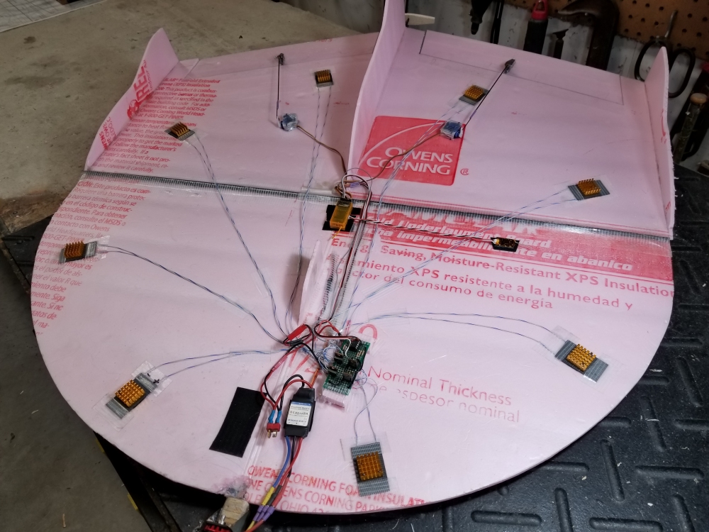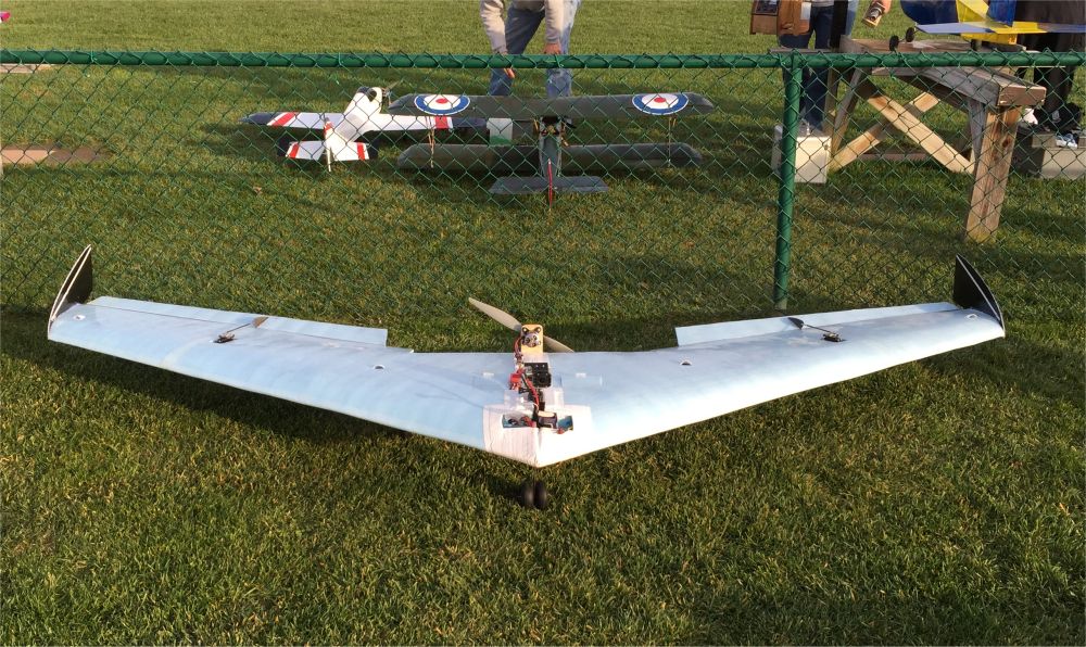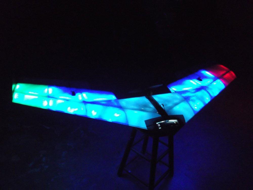 9 Foot Wingspan Blue Wing LED - This is a scaled up version of the 6 foot wingspan Blue Wing, with an E-Flite 32 motor and 50A ESC. There is a HK 401B gyro on each elevon servo, each tilted to allow stability on both the pitch and roll axis. It has a GoPro mount, red and green LED wingtip lights, and 6 super-bright LEDs facing down. The super-bright LEDs are controlled on/off via a commercial RC switch. The photos below are construction and flight photos of this 9' wing. FLYING