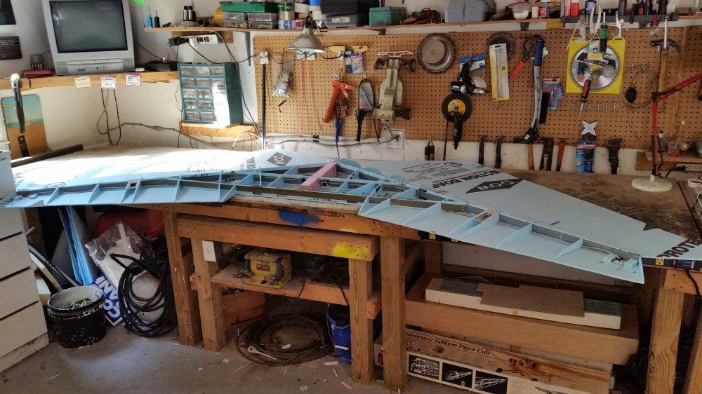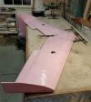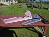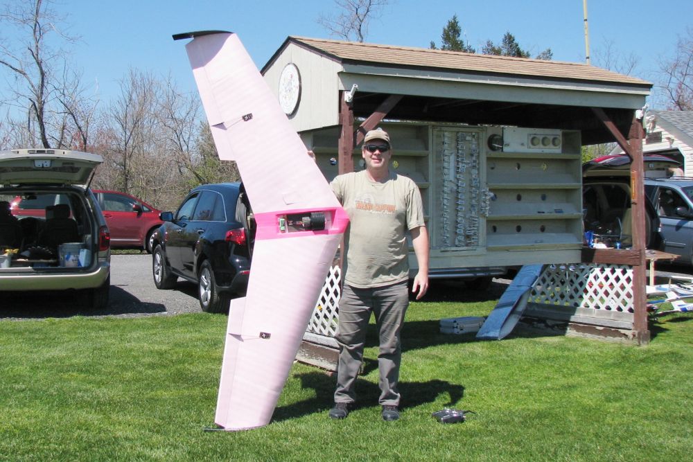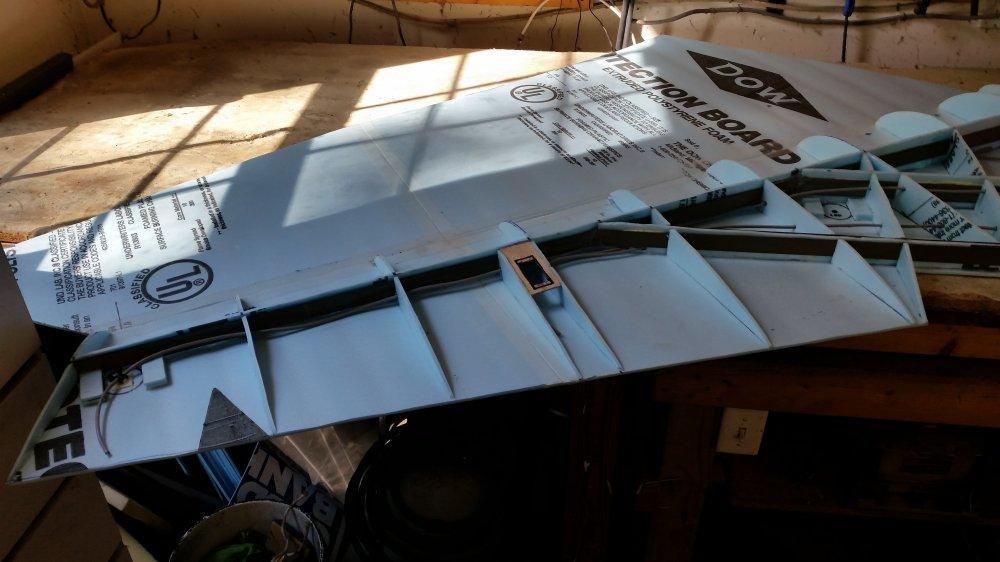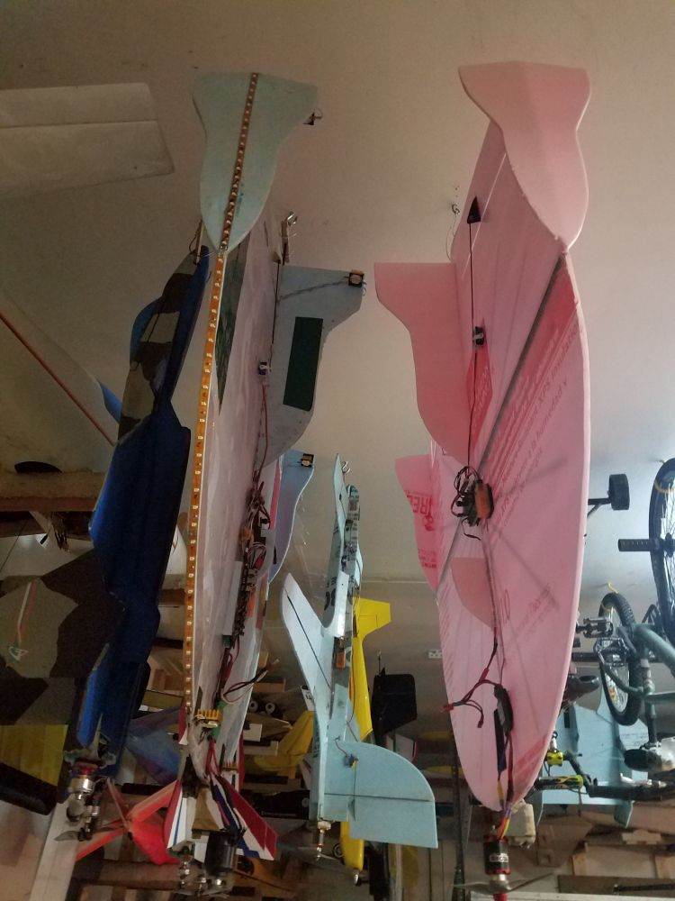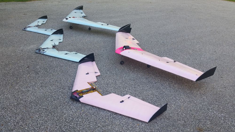 Blue Foam and Pink Foam Wings : I designed these wings to be built using either Dow blue foam or Owens-Corning pink foam 1/4" thick insulation. The main strength comes from carbon fiber doublers on the foam spars and cross bracing. I have built many copies of various sizes, and conducted a pink wing group build with my club. I worked with 12 flyers so everyone could have their own foam flying wing. There are 13 pink flying wings in our RC club now, all built in my garage over several build sessions. I provided the templates and plans, carbon fiber spars, foam, tape, glue, and building instructions, and everyone paid for or brought their own electronics. The standard wing has a two meter wingspan and is powered by 480 outrunner with a 40A ESC. All of the 5.5' span and larger wings have GoPro camera mounts and I have shot aerial video all over the US and Scandinavia with these wings. Most of these wings are set up for FPV, and another one is a transitioning VTOL tri-copter. |
