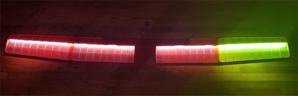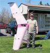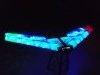 13 Foot Wingspan Pink Wing LED - Scaled up version of my 6 foot wingspan flying wings. This wing is powered by twin Tower Pro 3520 outrunner brushless motors, each with a 50A ESC. See this page for details and construction photos. The wing has external white LED strips facing down, internal LED strips to light the wing from the inside, red and green LED wingtip lights, 16 super-bright LEDs facing down, and 7 super-bright LED COB lightbulbs. |