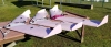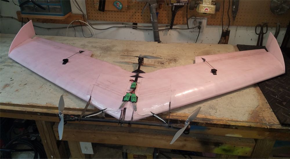 6 Foot Wingspan Pink Wing VTOL Tri-copter - This flying wing takes off hovering like a tri-copter, the front motors tilt down slowly as the wing picks up speed, and it transitions to forward flight. Landing is done by gliding or reversing the transition steps and hovering down. This page has the details on the airframe and avionics development. FLYING in HOVER - working - hover video @ YouTube FLYING in FORWARD FLIGHT - working - hover & forward flight video @ YouTube, on-board video of forward flight @ YouTube TRANSITION from HOVER to FORWARD FLIGHT - in work front : Neo 450 880kv outrunner motor (x2) front : HobbyKing 30A ESC, Dynam 25A ESC - SimonK firmware installed via USBASP & Atmega socket tool rear : Turnigy 3536 910kv outrunner motor rear : HobbyWing Skywalker 40A ESC - BlHeli firmware installed using Arduino Nano as programmer KK 2.1 flight controller with Steveis 1.19 for hover flight, OpenAero VTOL for transitioning flight two standard servos for elevons, two high-torque servos for front and rear motor tilt mechanisms Orange 618XL 6ch DSMX receiver with PPM output to KK 2.1 flight controller |