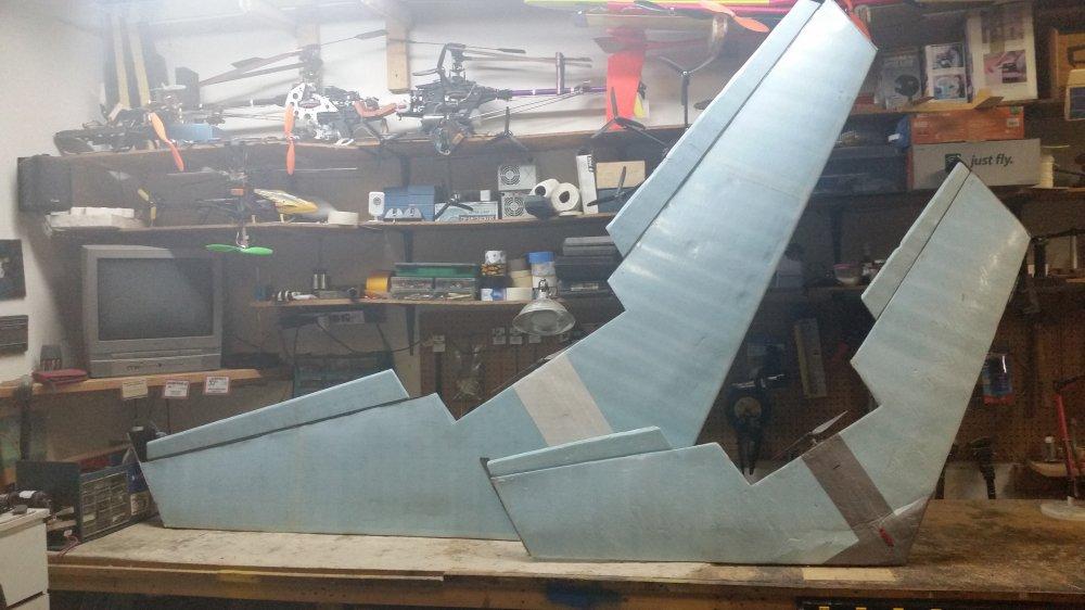 SU-37 - Thrust Vectoring : Built from JetSet44's plans at RCGroups. The only control surfaces are the independent full flying horizontal stabs. The twin electric motors are throttled independently via rudder mixing for yaw control, and are connected to the stabs for thrust vectoring. Made from BlueCor, this plane flies amazingly well. Twin counter-rotating 2408-21 outrunners with 18A ESCs, four channels [ left stab and motor tilt(1 servo), right stab and motor tilt(1 servo), left throttle(ESC), right throttle(ESC) ] FLYING |