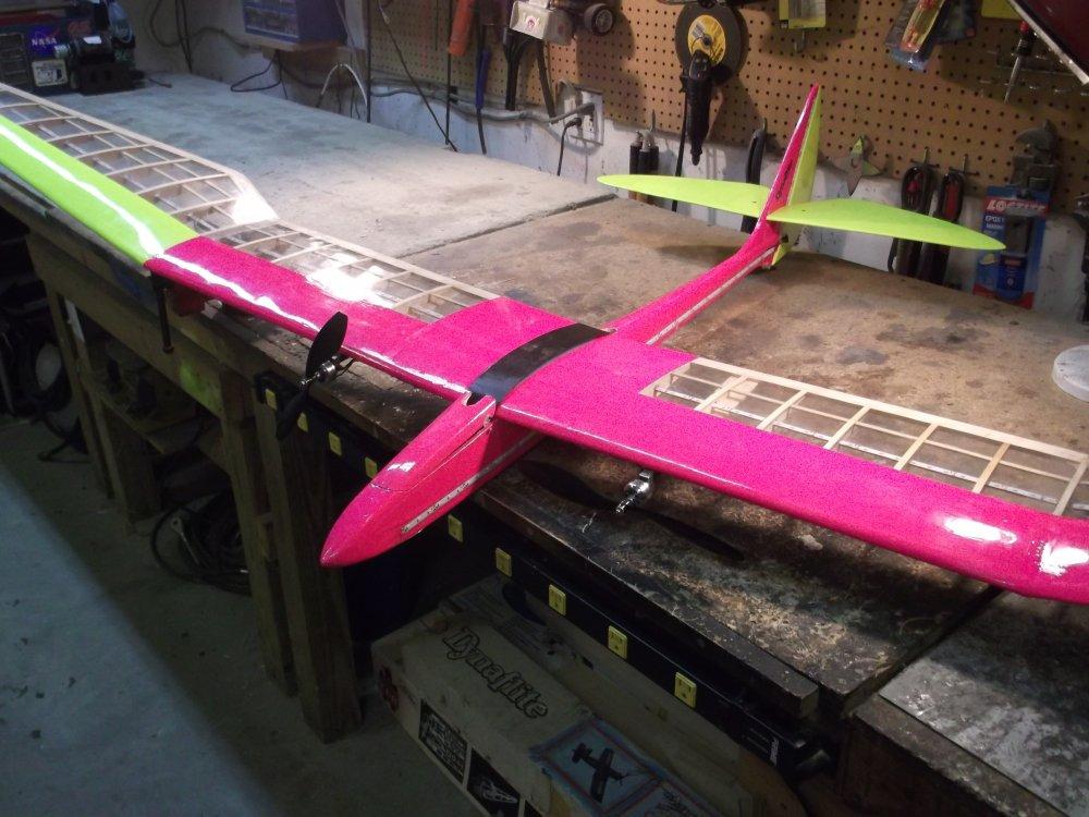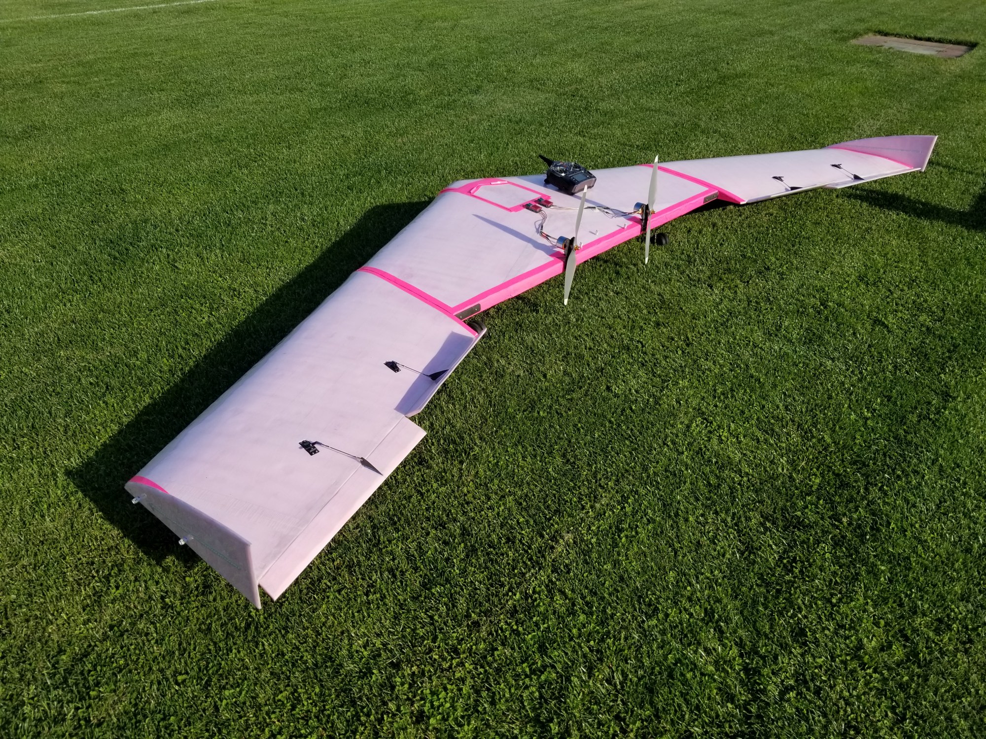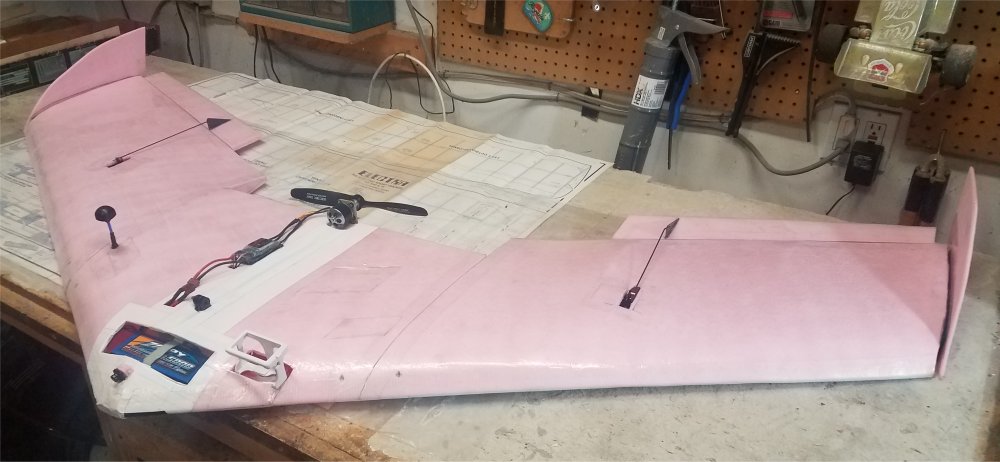 7 Foot Wingspan FPV Pink Wing - Flip32 F1 FC with MWOSD - I used the last of the left-over pink foam from my club group build to make this wing. It is powered by a Turnigy G25 outrunner and a Red Brick 50A ESC. FLYING - FPV Flip32 F1 flight controller all-in-one (AIO), MWOSD 2.0 SW - barometric pressure sensor for altitude, current and voltage sensors - flashed and configured special compile of iNav 1.7.2 via USB - flashed and configured MWOSD 2.0 via USB with MWOSD 2.0 Configurator - uplink commands from DSMX receiver via PPM - COM1: MWOSD (shared with USB) - COM2: GPS 5 hz update Orange 618XL 6ch DSMX receiver with PPM output Boscam TS832 600mW 5.8GHz video transmitter uBlox GPS receiver 1200 TVL 5-12V camera LC filters for power to FC, camera, video transmitter for cleaner video GoPro mount |