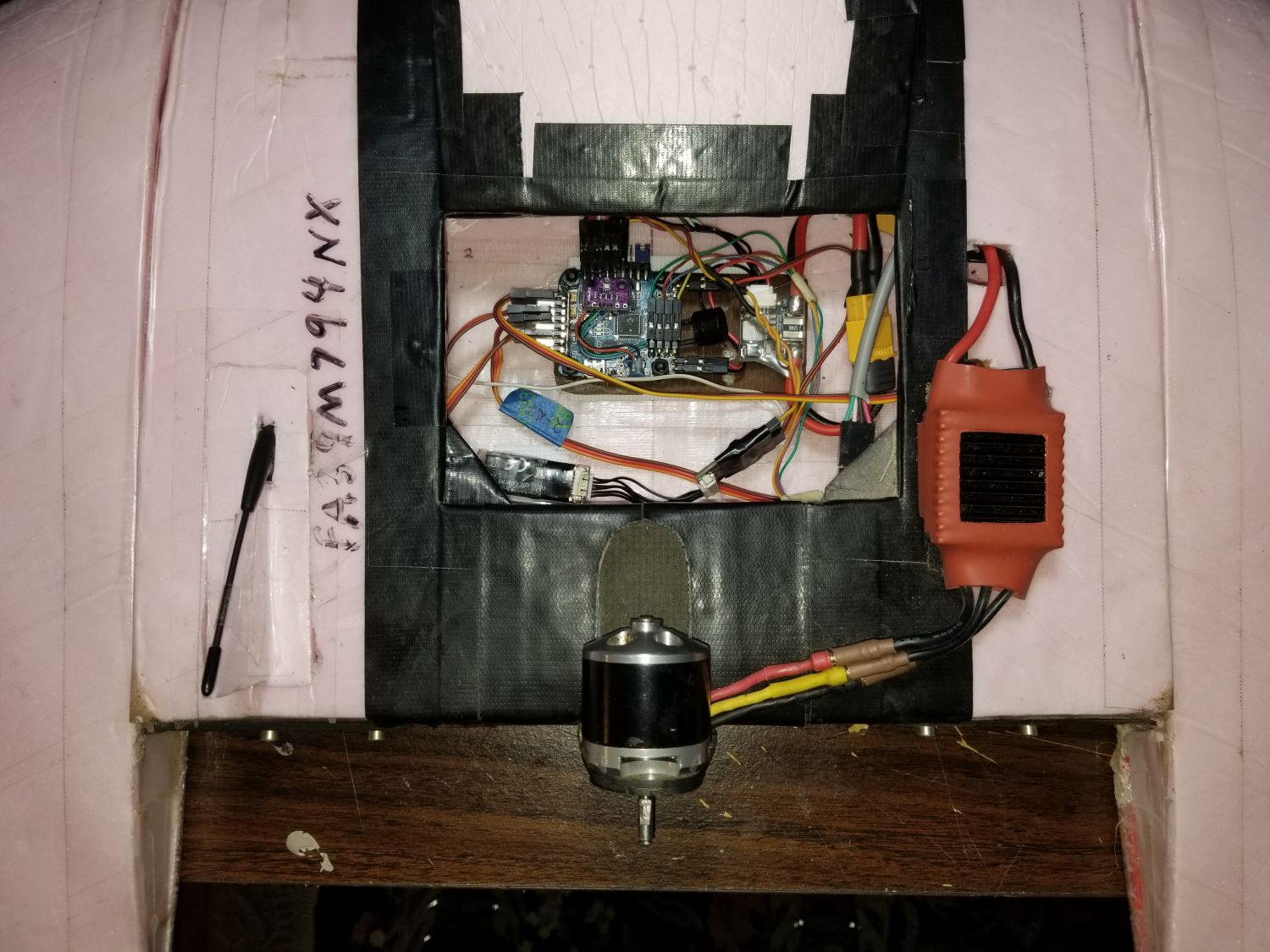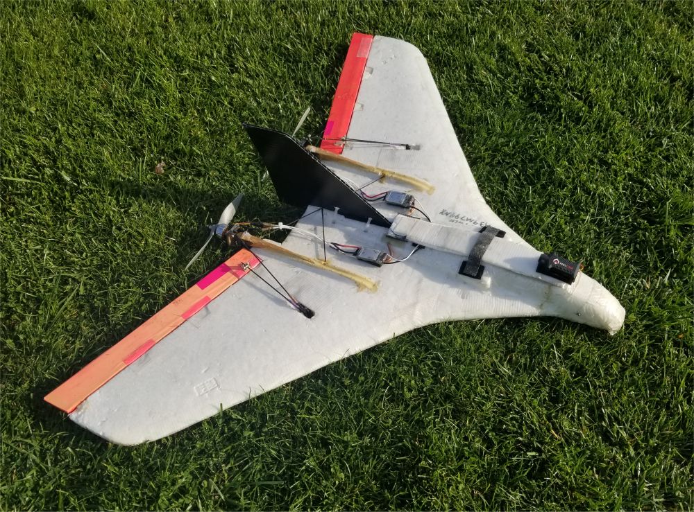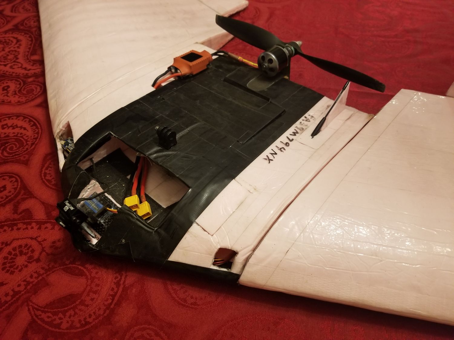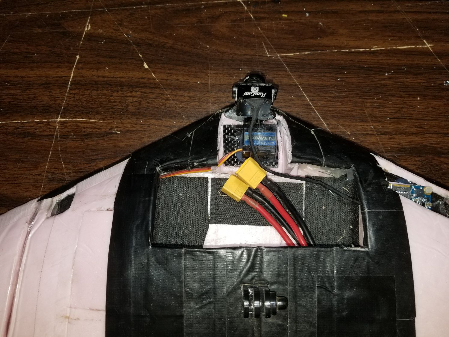 5 Foot Wingspan FPV Pink Travel Wing - I built this wing for traveling, using the same wing separating sections as the 6' travel wing, but the overall span is only 5 feet to allow it to fit in smaller luggage. It is powered by a 450 outrunner and 50A ESC. The ESC BEC provides 5V power for the servos; this 5V power is separate from the 5V power for the avionics which comes from a 7805 regulator with a large capacitor to protect against avionics brownout. Servos / control: left elevon (1 servo), right elevon (1 servo), throttle (ESC) FLYING - FPV The avionics have gone through four configurations, as I have experimented with different flight controllers. - The first configuration used a Naze32 F1 flight controller and a Lemon DSMX receiver. - The second configuration used a Flip32 F3 flight controller and a Crossfire receiver. - This setup also had a Runcam Split V2 HD nose camera with a servo for stabilized gimbal roll. - The third configuration used a Flip32 F1 flight controller and a Crossfire receiver. - The fourth and current configuration uses a SP Racing F3 flight controller and Crossfire receiver. - This setup also has separate MinimOSD hardware running MWOSD 2.0. SP Racing F3 flight controller + MinimOSD - barometric pressure sensor for altitude, current and voltage sensors - flashed and configured iNav 2.6.1 via USB - flashed and configured MWOSD 2.0 via FTDI adaptor with MWOSD 2.0 Configurator - COM1: MWOSD (shared with USB) - COM2: Crossfire uplink commands, downlink telemetry - COM3: GPS 5 hz update Crossfire Nano Receiver in right wingtip - use TBS LUA scripts to configure Rx output channels - Rx channel 1 & 2 : Crossfire Tx/Rx - Rx channel 4 : SmartAudio - controls video transmitter via Crossfire LUA scripts on TX16S transmitter - RC channel 8 is set to output RSSI as signal, flight controller reads channel 8 for RSSI in video overlay AKKTek FX2 Dominator 5.8 GHz VTx in left wingtip - SmartAudio is connected to Crossfire receiver to allow video transmitter control from TX16S Beitian BN-180 GPS receiver in center wing Nose camera GoPro mount on the nose to hold a GoPro 10 with built-in video stabilization at 4K resolution LC filter for clean 12V power to video transmitter |