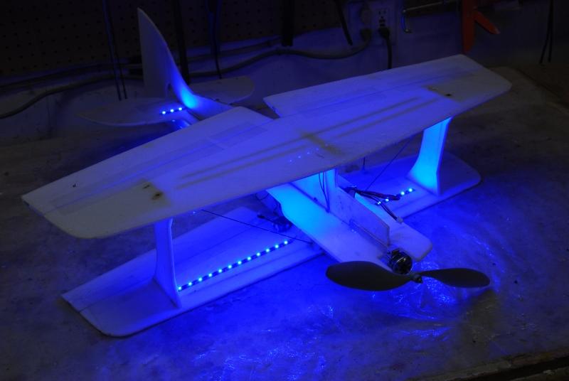 Night Flyers - There are many electric aircraft scattered throughout this main page that I have made for night flying. All of these night flyers have fixed LED strips, and five of these night flyers also have home-made RC-controlled LED flashing sequencers for their LEDs. This page shows these night flying planes and their various LED setups, along with wiring schematics and code for the PICs controlling the flashing sequences. Any plane listed above with 'LED' in the name is a night flyer, covered with LEDs.