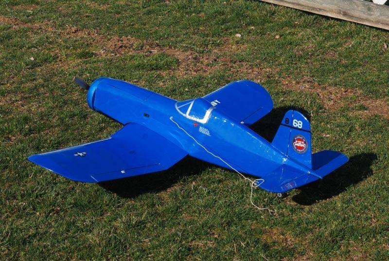 Dynaflite F-4U Corsair : Built from kit, turtle deck raised to hold internal pipe and scale ABS cowling added, and later modified for electric power. It was flown with a Tower Pro 3520 outrunner brushless motor and 50A ESC, but is currently set up for static display, so it does not have any electronics in it. FLOWN - currently set up for STATIC DISPLAY |