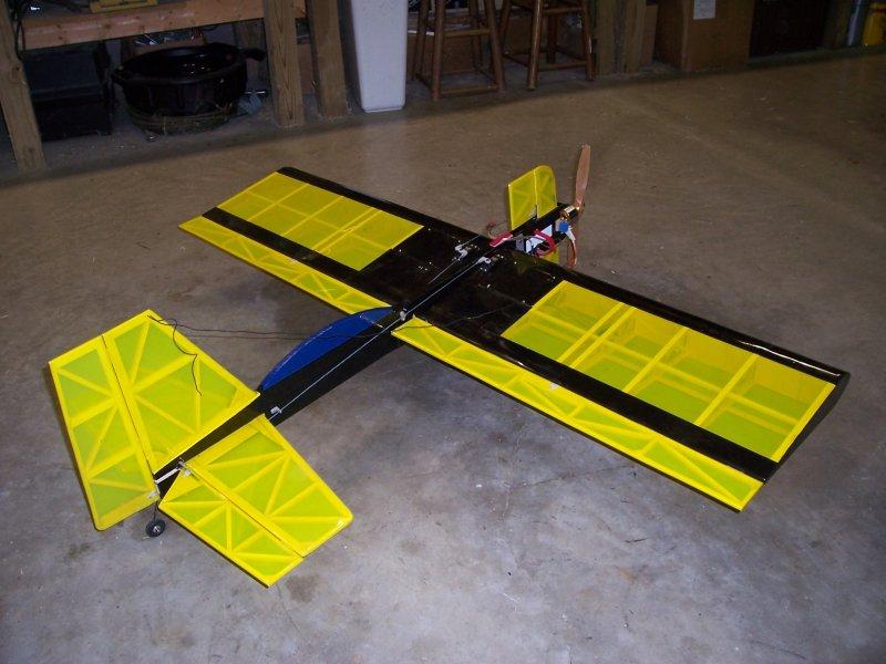Double Trouble Electric : Built from plans. This copy of the Double Trouble was built from the start to be powered by an electric motor. All power comes from a 6S 2650 mah lipo battery pack. The second photo shows the glow and electric Double Troubles together; they fly about the same. Turnigy 4250-410 outrunner with a 70A ESC. Five channels [ ailerons(2 servos), rudder and nose rudder (1 servo), elevator(1 servo), throttle(ESC) ] FLYING |
