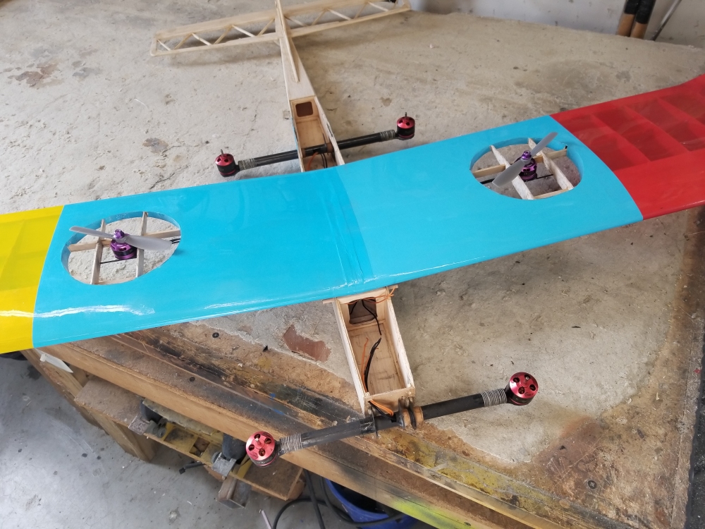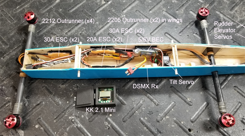 Electra VTOL Hexacopter - I built this Electra kit to be a VTOL electric glider, with four motors on the fuselage that are vertical for takeoff and landing, and rotate to horizontal for forward flight. There are also two fixed motors in the wings that are just for vertical lift and roll control. A KK 2.1-mini running OpenAero VTOL software is the flight controller, and the RC control is via a 6 channel DSMX receiver with PWM & PPM outputs. All the electronics are installed internal to the fuselage. Under Construction Tilt motors on fuselage - 2212 outrunners (x4), 30A ESC (x4) Fixed motors in wing - 2205 outrunners (x2), 20A ESC (x2) KK 2.1 Mini Flight Controller - OpenAero VTOL software, drives 6 ESCs & tilt servo Orange 618XL 6ch DSMX receiver with PPM output - PPM --> KK 2.1 Mini Flight Controller - aileron PWM --> rudder servo - elevator PWM --> elevator servo 6V switching regulator for power to Rx, KK 2.1, servos |